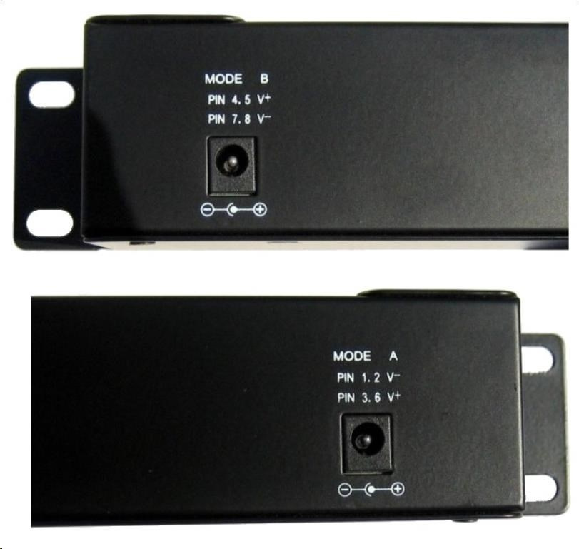 Použiť:Vstup pre napájanie cez dva 2,1 mm 60V jacky, všetkých 12 portov je napájaných vždy z oboch vstupov súčasne v režime podľa zvoleného A/B vstupu:
