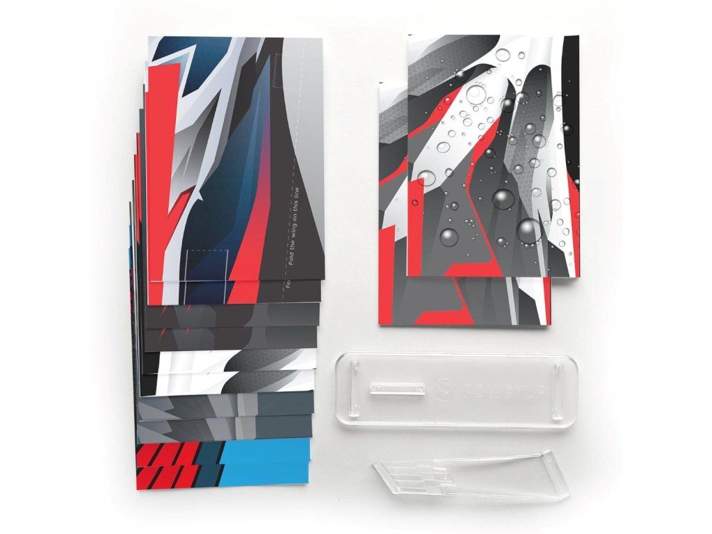 Krabica ukrýva presne 12 kusov šablón pripravených na okamžité zloženie. Desať z nich tvorí prémiový japonský papier rozdelený do 6 rôznych motívov. Zvyšné dva hárky zastupujú špeciálny vodoodolný materiál Tyvek. Súčasťou setu je navyše praktický stolný stojan. Ten perfektne poslúži vo chvíľach, keď práve nelietate, a umožní vám obdivovať ten najvydarenejší kúsok priamo na pracovnom stole.