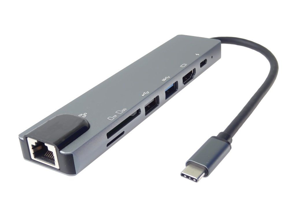 PremiumCord USB-C na HDMI + USB3.0 + USB2.0 + PD + SD/TF + RJ45 adaptér Tento adaptér umožňuje vysoce kvalitní převod videa a zvuku z USB-C konektoru na HDMI konektor pro další monitor/TV/projektor. Funguje jako externí grafická karta. Umožní přidat další monitor a USB periferii nebo paměť a současně napájet přes konektor PD. Umožňuje také pracovat na více obrazovkách současně. Adaptér připojí do sítě ethernet a umožní připojit externí USB paměť nebo vložit paměťovou kartu. Udělejte si svůj pracovní den více zábavný a pohodlnější, pracujte na dvou obrazovkách současně. *Víceportový adaptér USB-C obsahuje vysokorychlostní port Ethernet / RJ-45, nabíjecí port 87 W PD, porty USB 3.0 a USB2.0, video výstup 4K HDMI + čtečka karet Micro SD a TF 2.0 *Rozlišení obrazu HDMI: 4K@30Hz a FULL HD 1080p *Vstupní konektor: USB-C male / Thunderbolt 3.0 *Výstupní konektor: HDMI female + USB3.0 female + USB2.0 female + PD (power delivery) + čtečka karet SD/TF + RJ45 konektor na ethernet 10/100Mbps *HDMI konektor na připojení dalšího monitoru, TV, projektoru *PD Konektor USB-C pro nabíjení 20V až 5A, *Čtečka paměťových karet SD/TF *USB3.0 a USB2.0 konektor pro připojení flash paměti nebo jiného USB zařízení nebo pro napájení přes USB *Konektor RJ45 pro připojení to počítačové sítě nebo do internetu *Adaptér přenáší digitální obrazu i zvuk *Plug and play. *Typ C konektor s možností zapojení v jakémkoliv směru *Barva: šedá *Kompaktní zastříknuté odolné pouzdro *Balení v sáčku s EAN kódem a popisem *Funguje s novými zařízeními s USB-C podporujícími DisplayPort Alternate modes