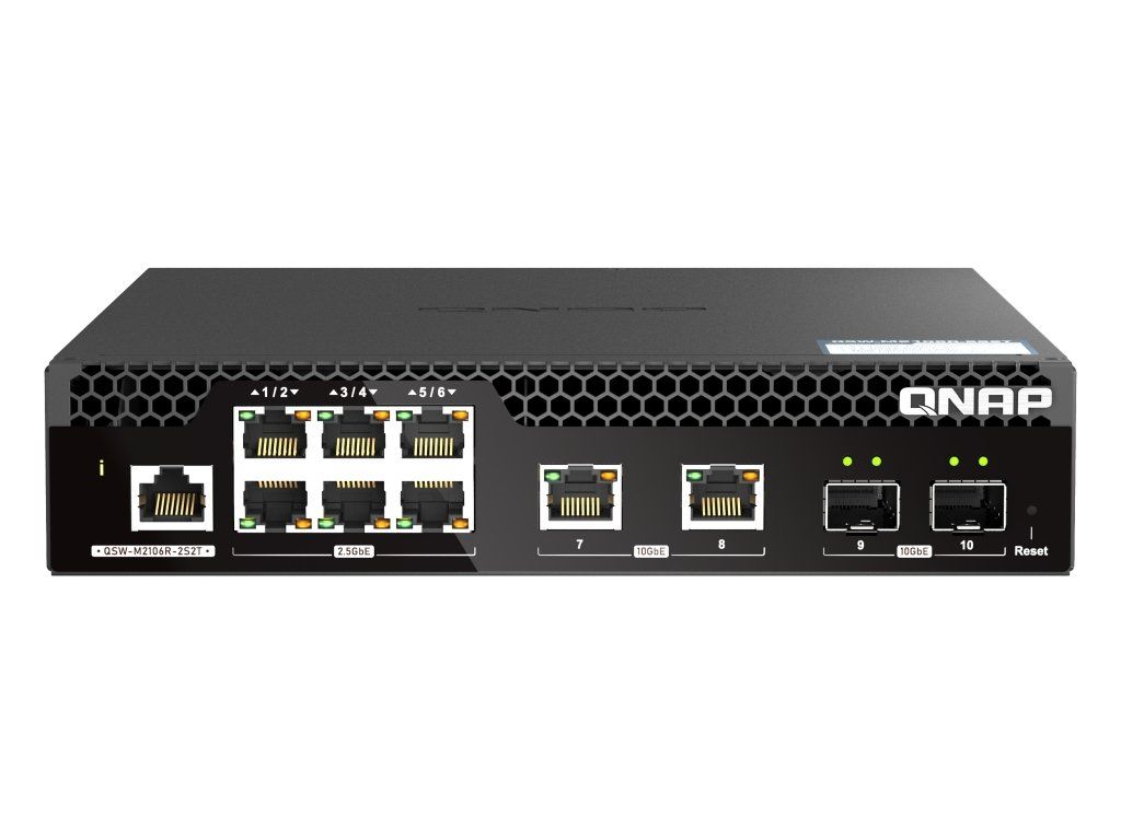 Zařízení QSW-M2106R-2S2T je webově řízený switch úrovně 2 se dvěma optickými porty SFP+ 10GbE, dvěma porty RJ45 10GbE a šesti porty RJ45 2,5GbE. Zařízení QSW-M2106R-2S2T podporuje přepínání a správu sítě úrovně 2 (L2) prostřednictvím uživatelsky vstřícného webového rozhraní, nabízí flexibilní nasazení v hybridních vysokorychlostních síťových prostředích a poskytuje řešení pro správu sítě na základní úrovni. Díky poloviční šířce lze pro úsporu místa do prostoru racku 1U nainstalovat dvě zařízení QSW-M2106R-2S2T. *Obsahuje dva optické porty SFP+ 10GbE (zpětně kompatibilní s SFP 1G) a dva porty RJ45 10GbE kompatibilní s technologiemi NBASE-T pro podporu pěti rychlostí (10G / 5G / 2,5G / 1G / 100M) pro vysokorychlostní sítě. *Šest portů 2,5 GbE RJ45 umožňuje okamžitě znásobit rychlost sítě 2,5krát při použití stávajících kabelů Cat 5e. *QNAP Switch System (QSS) se snadno používá a má přehledný ovládací panel, správu portů a průvodce nastavením, díky čemuž je centrální správa sítě intuitivní. *Poskytuje funkce správy úrovně 2 (jako jsou LACP, VLAN, ACL a LLDP) pro pracovníky IT, aby bylo možné účinně řídit šířku pásma sítě a zvýšit zabezpečení. *Je jedním z mála webově řízených switchů, které podporují protokol Rapid Spanning Tree Protocol (RSTP). Lze snadno a efektivně zavádět malé/střední sítě, které podporují rozšíření, redundanci a prevenci smyček. *QSS je možné aktualizovat pouhým kliknutím, což pracovníkům IT pomáhá zajišťovat zabezpečení sítě.