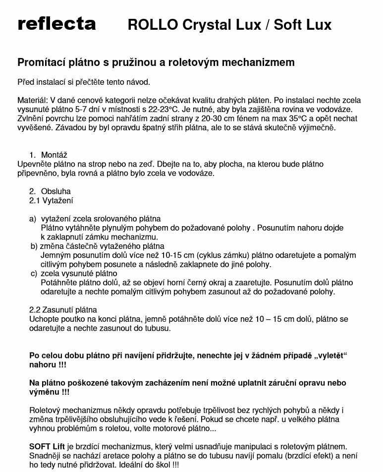 Roletové plátno ROLLO CrystalLine 240x175cm, viditeľná plocha 236x133cm, 16:9, 107"/271cm, biely hranatý kovový tubus 7x255cm/10kg, uchytenie na stenu alebo strop, materiál BetaLux - biela 0,35 tkanina 300g/m2 s 2cm čiernym okrajom a zadnou stranou, Gain=1,0, pozorovací uhol 120°. Lux - biely matný povrch pre maximálne verný a kontrastný obraz pri aspoň čiastočnom zatemnení. PVC materiál s textilným základom vytvára rovný povrch bez vĺknutí, ale na okrajoch môže dôjsť k prohnutiu - postupne mizne. Jednoduché uchytenie 4 skrutkami na plastových stranách plátna - stena alebo strop. Možnosť aretácie polohy plátna pri každom otočení mechanizmu. Pozor pri spätnom navíjaní plátna je nutné plátno podržať - nesmie dôjsť k rýchlemu navinutiou, ktoré pri náraze na tubus môže poškodiť vnútorný mechanizmus bez možnosti uplatnenia záručnej doby.