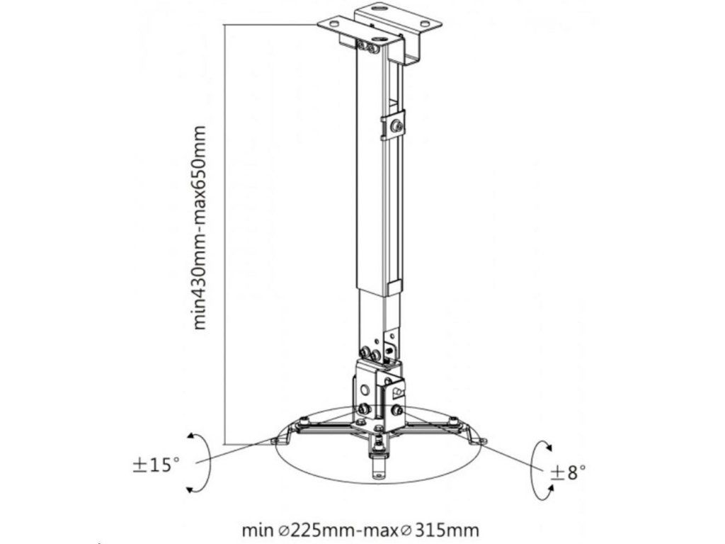 Stropný a nástenný držiak na dataprojektory - vzdialenosť od stropu 43-65cm alebo steny 35-56cm, prístroj nie je možné otáčať, je možné nakloniť +/- 8° bočne a +/- 15° v smere, maximálna záťaž 20kg, biela. Univerzálny systém uchytenia dataprojektorov (rozsah 22,5-31,5 cm).Popis produktu bol preložený pomocou umelej inteligencie a môže obsahovať nepresnosti.