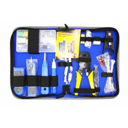 Obsah: - 1ks tester kabelů s hledací sondou - 1ks detektor napětí - 1ks krimpovací kleště 3 v 1: RJ45, RJ11, RJ12, konektory typ 8P8C, Cat5, Cat5e, Cat6, Cat3 4P4C, 6P6C - 1ks krone narážecí nástroj - 1ks ostraňovač izolace vodičů - 1ks krone spojka -RJ11 - 15ks 6P6C modulární konektor RJ11 - Krone modulová šňůra 110-RJ11 - 10 ks konektor Cat5e 8P8C - 10 ks konektor Cat6 JR45 8P8C - 1ks RJ45 prodlužovací rozdvojka se 2 porty - 1ks 6P prodlužovací adaptér - 1ks BNC-RJ45 adaptér - 20ks Stahovací páska na kabely - 1ks značkovací pero - 1ks úložný box na konektory - 1ks sluchátka - 1ks brašna na nářadí