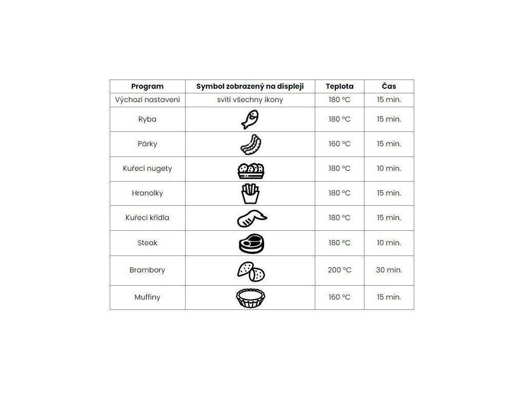 8 přednastavených programů: 1) Ryby 2) Párky 3) Kuřecí nugety 4) Hranolky 5) Kuřecí křídla 6) Steak 7) Brambory 8) Muffiny • Fritování & grilování 2v1 •