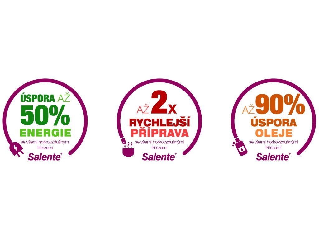 Model Salente HotAir nabízí: • 2x rychlejší přípravu pokrmů • Až 90% úsporu oleje při smažení • 50% úsporu elektrické energie Můžete jíst zdravěji a přitom nepřijít o své oblíbené smažené hranolky a navíc ještě ušetřit nemalé finanční prostředky za elektrickou energii i drahý olej. Horkovzdušná fritéza nepotřebuje ke smažení téměř žádný olej díky cirkulaci horkého vzduchu. Ve srovnání s klasickou fritézou ušetří až 90% oleje a vaše kuchyň tak zůstane bez zápachu přepáleného oleje. Oproti běžné elektrické troubě připraví pokrm až 2x rychleji.