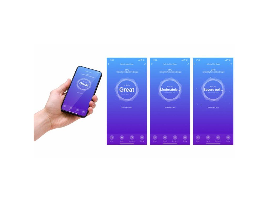 Čističku vzduchu je možné propojit s mobilním telefonem díky aplikaci Tuya SmartLife, která je ke stažení jak pro mobilní telefony iPhone, tak pro všechny mobilní telefony se systémem Android. Aplikace nabízí rozšířené možnosti ovládání a přehledy jako jsou: • Zobrazení venkovního počasí a teploty dle lokality • Zobrazení úrovně znečištění v místnosti • Zobrazení rychlosti ventilátoru • Zobrazení stavu filtru • Zobrazení odpočtu časovače po minutách • Možnost zapnutí/vypnutí • Možnost volby rychlosti ventilátoru • Možnost nastavení časovače • Možnost nastavení pravidelného zapínání i vypínání každý den v týdnu nebo jen v určité dny na libovolnou dobu • Možnost resetování životnosti filtruBeztlačítkový ovládací panel