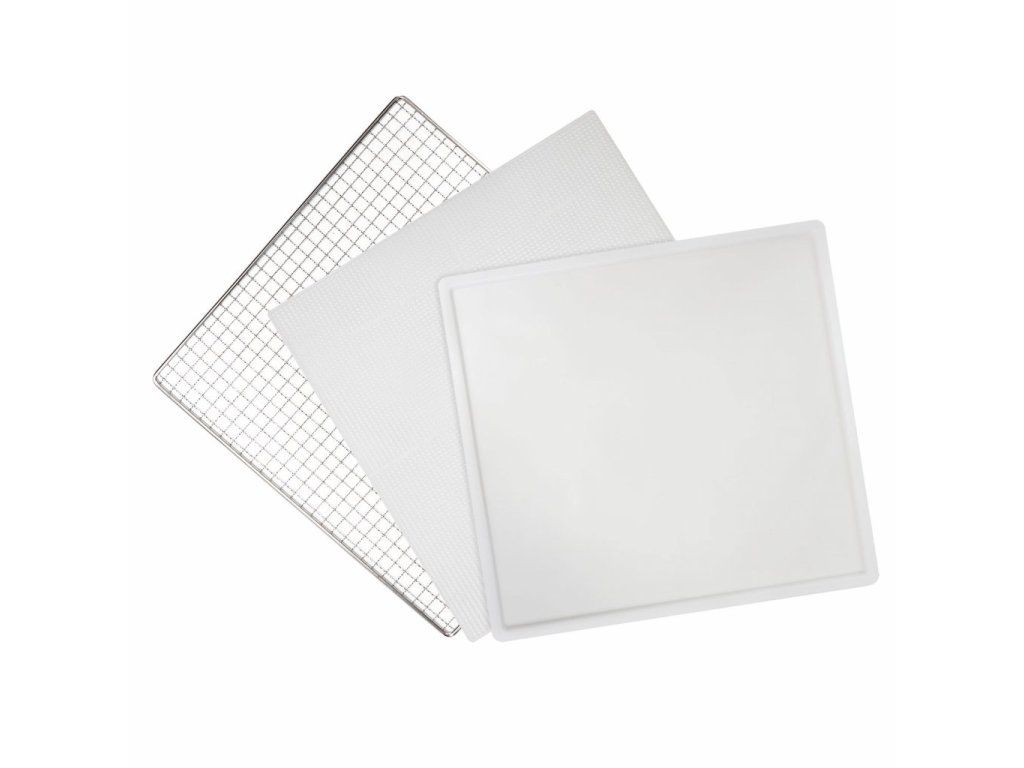 Výbavou navíc je u tohoto modelu sada deseti sušících plat s jemným síťováním pro sušení jemnějších a lepkavých surovin (např. hub, bylinek, banánů, rajčat atp.). Dodáván je i odkapávací tác na dno sušičky, který zachycuje přebytečné šťávy z některých surovin a výrazně tak usnadňuje čištění nerezového interiéru sušičky. Plata i tác mají rozměr 39,4 × 39,4 cm.Extra velký ventilátor