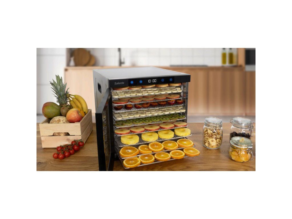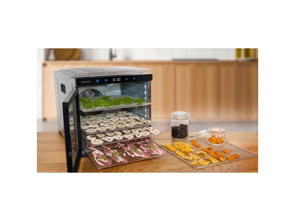 • Celonerezové robustní provedení • Extra velká sušící plata (39,4 × 39,4 cm) • Ideální pro sušení hub, ovoce, zeleniny, bylinek, čaje, masa atp. • Extra výkonný 18 cm ventilátor • Rovnoměrné sušení ve všech patrech • 10 nerezových sušících plat • 10 vložek na plata s jemným síťováním • Beztlačítkový dotykový digitální ovládací panel s displejem