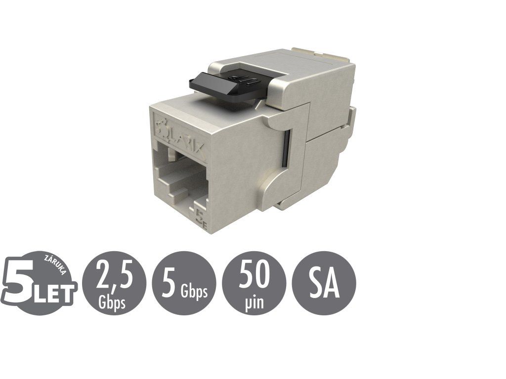 Samořezné keystony Solarix se vyznačují velmi jednoduchou instalací, ke které není nutné použít zařezávací nástroj. Tyto keystony bez problémů splňují parametry specifikované v mezinárodních standardech strukturované kabeláže ANSI/TIA 568, ISO/IEC 11801 a EN 50173 pro kategorii 5E a třídu vedení Class D, včetně všech nejnovějších dodatků. Keystony jsou osazeny 180° samořeznou svorkovnicí, která je označena barevným schématem podle typu zapojení, a to buď podle standardu T568A, nebo T568B. Do této svorkovnice je možné zařezat kabely typu drát s vodiči o velikosti AWG 26 – 22. Standardní barva nestíněných samořezných keystonů Solarix je černá, u stíněné verze je tělo modulu opatřeno stříbrnou kovovou částí. Díky svým kompaktním rozměrům jsou tyto samořezné keystony kompatibilní s modulárními zásuvkami většiny výrobců (např. ABB, Schneider, Legrand, Moeller, Hager, Obzor atd.). Tuto kompatibilitu si můžete ověřit v tabulce kompatibility, která se nachází v záložce ''Odkazy''.Technické parametry Kategorie: CAT5E Podporované protokoly: 2.5G/5GBASE-T a nižší Stínění: ano Min. životnost portu: 1 000 zapojení/odpojení Krytí kontaktů: 50 µ zlata a 100 µ niklu Svorkovnice: samozářezová Min. životnost svorkovnice: 200 zařezání Velikost a typ vodiče: AWG 26 - 22, drát Materiál nekovových částí: FR plast podle UL94-0 Barva: černá (vnitřní část), stříbrná (kovové tělo) Skladovací teplota: -40 až 70 °C Provozní teplota: -10 až 60 °C Max. provozní vlhkost: 93 % Balení: 1 ks, plastový sáček Rozměry balení (výška x šířka x hloubka): 145 mm x 90 mm x 20 mm Přepravní balení: 280 ks, kartónový box Rozměry přepravního balení (výška x šířka x hloubka): 230 mm x 515 mm x 400 mm