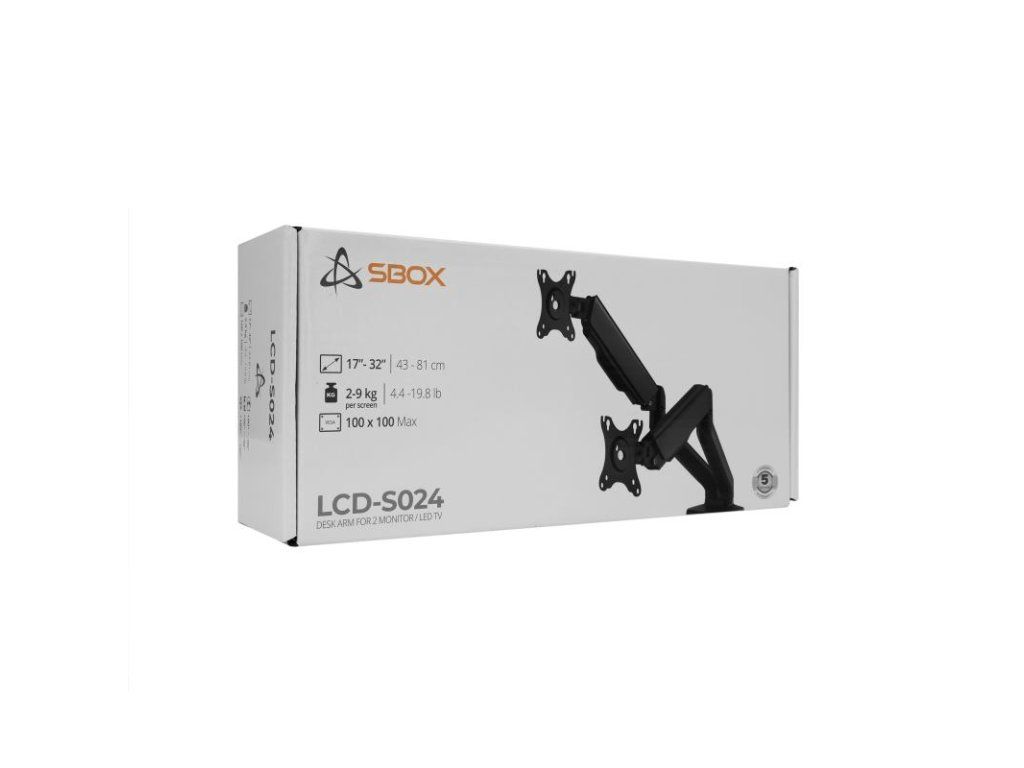 SBOX LCD-S024-2, Stolný držiak na 2 monitory 17" - 43" - Počet obrazoviek: 2, Minimálne VESA: 75x75, Maximálne VESA: 100x100, Maximálne zaťaženie (kg): 2x2-9, Minimálna veľkosť obrazovky: 17'' / 43 cm, Maximálna veľkosť obrazovky: 32'' / 81 cm, Vertikálny sklon: +90°/ -90°, Otočenie: +90° / -90°, Otáčanie obrazovky: +180°/ -180°, Pokrytie svorky (mm): svorka (10 - 80 mm), priechodka (10 - 45 mm), Materiál: hliník/oceľ/plast, Farba: Čierna, Povrchová úprava: Práškové lakovanie, Pre zakrivené obrazovky: Áno, Vedenie káblov: Áno, Odnímateľná doska VESA: Áno, Inštalácia: Stôl, Rozmery (mm): 937x105x570