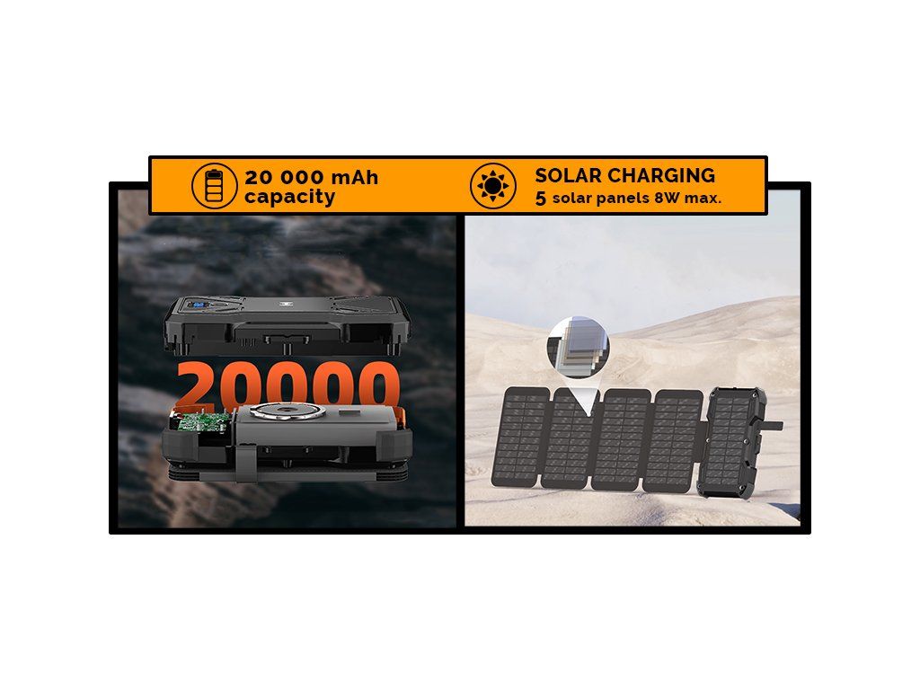 kapacitou 20 000 mAh/74 Wh a přináší revoluční způsob, jak získat energii na svých cestách. Díky rozkládacím solárním panelům můžete efektivně dobíjet svá elektronická zařízení přímo z energie slunce, což zajišťuje, že budete mít stále plně nabitý telefon, tablet nebo jinou elektroniku.