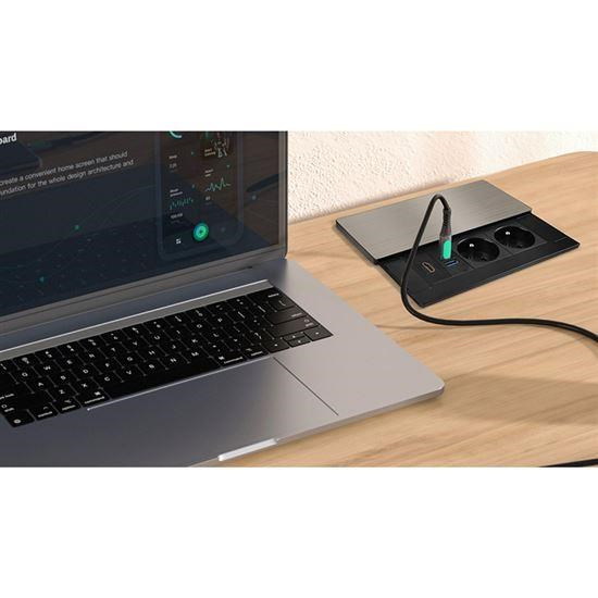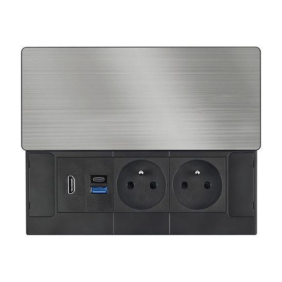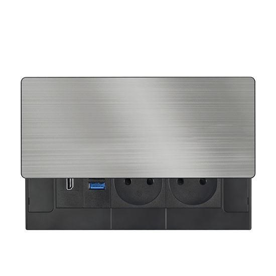 Tento vstavaný blok zásuviek ponúka viac než len napájanie – kombinuje dve sieťové zásuvky 230 V, USB rýchlonabíjačku a HDMI port v jednom kompaktnom module. Vrchný kryt z matnej tmavej nehrdzavejúcej ocele (inox) s posuvným mechanizmom sa ľahko začlení do moderného interiéru pracovných stolov, prezentačných priestorov aj obývacích izieb. Vďaka káblu dlhému 2 metre je inštalácia flexibilná a pohodlná.