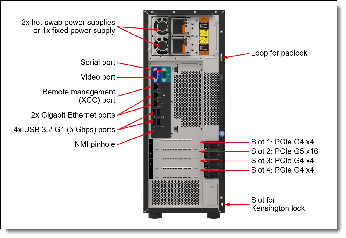 Zadní porty: *4x USB 3.2 G1 (5 Gb/s) *1x VGA *1x RJ-45 systems management (XCC) *2x RJ-45 GbE *1x serial port *1x NMI pinhole