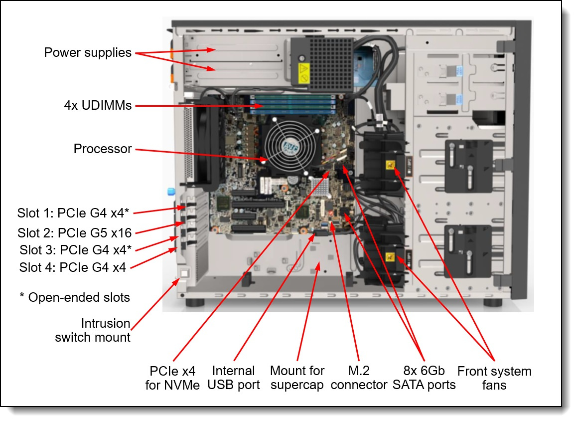 *Procesory Intel Xeon řady E-2400 (''Raptor Lake'') až 8 jader a rychlosti jádra až 3,5 GHz *Procesory Intel Pentium G7400 a G7400T (''Alder Lake'') se 2 jádry a rychlostí jádra až 3,7 GHz *Až čtyři 4800 MHz DDR5 ECC UDIMM poskytují rychlost a kapacitu až 128 GB *Čtyři sloty PCIe pro rozšíření I/O, z nichž jeden má nové rozhraní PCIe Gen5 pro maximalizaci I/O výkonu. *Nové vysokorychlostní řadiče RAID od Lenovo a Broadcom poskytují 12 Gb SAS připojení k propojovacím deskám disků *Server má dva integrované porty Gigabit Ethernet *Server nabízí jeden slot PCIe 5.0 plus tři rozšiřující sloty PCIe 4.0 I/O Specifikace