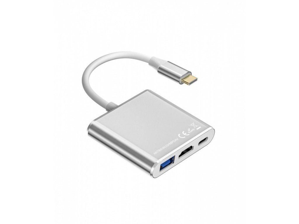 TB Adapter HUB USB C 3v1 - HDMI, USB, PD stříbrný Adaptér umožňuje rozšířit možnosti notebooku, tabletu nebo chytrého telefonu - jeden port USB C na zařízení se změní na multifunkční rozbočovač: *HDMI: 4K@30Hz *USB 3.0: přenos 5 Gb/s *USBC C (Power Delivery): Výkon 60W/100W *Funguje prakticky se všemi zařízeními s portem USB C. Můžete jej použít k připojení: smartphonu, projektoru, tabletu, myši, klávesnice, monitoru, notebooku, pevného disku, pendrive, fotoaparátu. Není nutná instalace softwaru. Každý ze 3 portů lze používat současně. Port USB C umožňuje nabíjet hlavní zařízení, zatímco jsou k němu připojeny další periferie. Hliníkový kryt zabraňuje zahřívání adaptéru. Balení: kartonová krabice Doživotní záruka Konektory #1: USB typu C samec Konektory #2: USB typu C samice Standard: USB 3.0/USB 3.1 gen 1 Barva: stříbrná