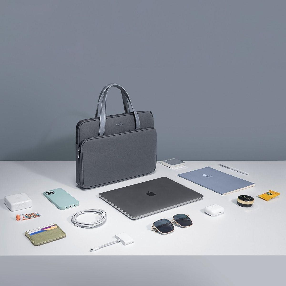 Dizajnerský tím značky Tomtoc spája aktuálne trendy s nadčasovým pojetím tvaru a používateľskou priateľskosťou. Ich brašne sú kompaktné, do detailu premyslené a vďaka kvalitným materiálom vydržia dlhé roky ako nové. Hebké vrecá s flísovým povrchom chránia pevná vonkajšia sivá tkanina a tašku dopĺňajú komponenty z mäkkej veganskej kože. Brašnu je možné nosiť na dlhom popruhu cez rameno, za príjemnú rúčku alebo ju pri dlhších cestách môžete vďaka ľahkosti a malým rozmerom umiestniť do kufra či iného väčšieho zavazadla.