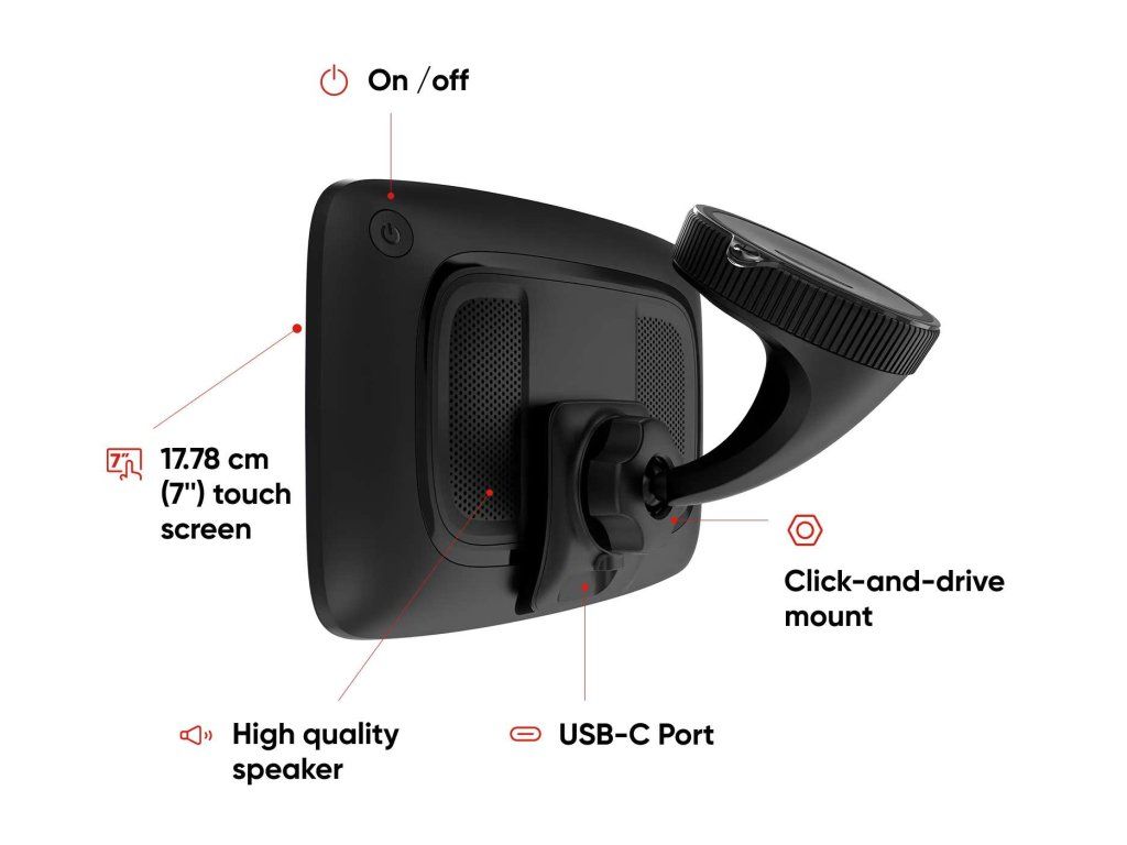Na 7" dotykovej obrazovke si môžete pozrieť svoju trasu vo vysokých detailoch. A vďaka ovládaniu pomocou hlasových príkazov môžete zariadenie GO Camper Max ovládať bez toho, aby ste z rúk zložili volant. Jednoducho použiteľný držiak Click-and-Drive navyše bezpečne drží navigačné zariadenie na mieste.