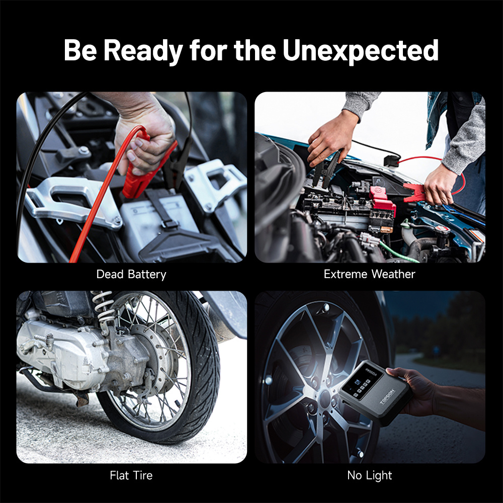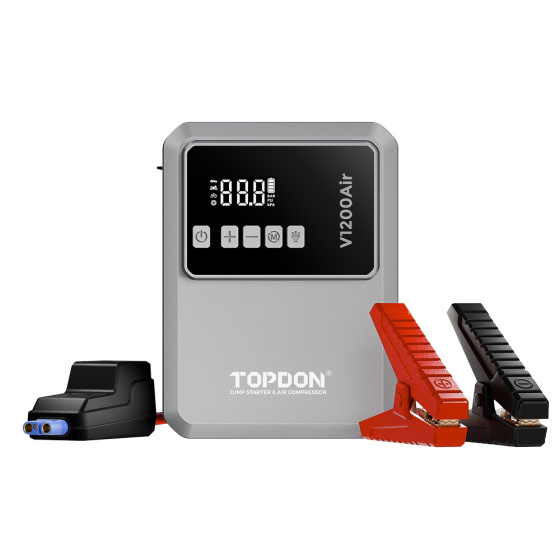 TOPDON Car Jump Starter JumpSurge V1200 Air – startovací zdroj a kompresor v jednom TOPDON V1200 Air je multifunkční zařízení, které vám ušetří místo v kufru i starosti na cestách. Díky startovacímu proudu 1200 A spolehlivě nastartuje 12V vozidla – osobní auta, motorky, SUV i menší dodávky. Už se nemusíte obávat vybitých baterií, protože pomoc je vždy po ruce. S podporou motorů až do 6,0 l benzínu nebo 4,5 l nafty vám V1200Air umožní jednoduše vyrazit během několika minut.