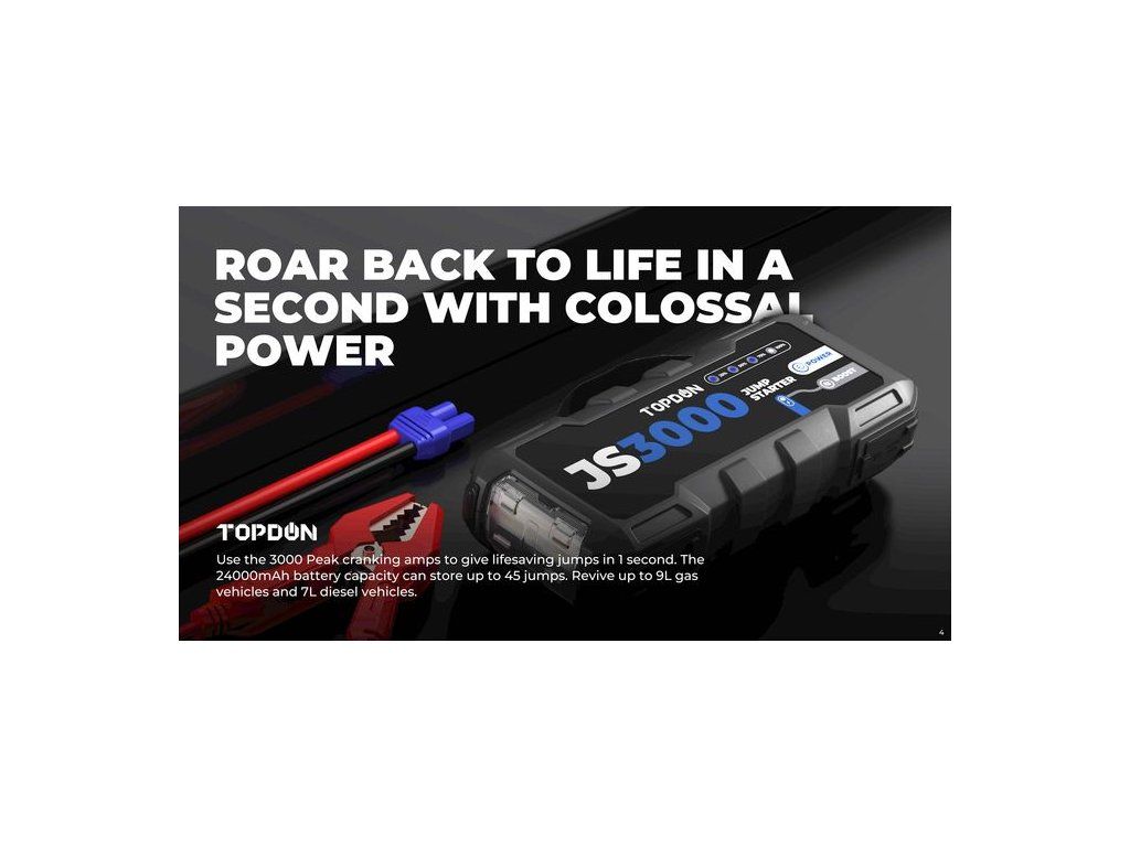 CAR JUMP STARTER JUMPSURGE 3000 Maximálně spolehlivý a výkonný car jump startér JumpSurge 3000 s kapacitou 24000mAh (88,8Wh) a startovacím proudem až 3000A. Ideální zařízení, které kombinuje výkonný a moderní startovací zdroj pro Vaše vozidla, lodě, motocykly, skútry atd. S úžasným výkonem 3000A nastartuje Váš dopravní prostředek při vybité baterii až do maximálního objemu 7.0L pro naftový motor a 9.0L pro benzínový motor a to opakovaně v závislosti na objemu Vašeho motoru. Tento car jump startér můžete používat pro pohotovostní starty nejen vozidel, ale i motocyklů, skútrů, lodí, čtyřkolek, sněžných skútrů, karavanů, osobních i nákladních vozidel s 12V okruhem, atd. Celkem 6 elektronických ochran zajistí bezpečnost Vašeho přístroje, startovacího zdroje JumpSurge 3000, i Vašeho vozidla. Vše na základě předpisů CE a EU. Buďte v bezpečí. Díky kapacitě 24000mAh a podpoře rychlonabíjení QC3.0 jej můžete využít i pro rychlé nabíjení jakékoliv drobné elektroniky. Dále JumpSurge 3000 podporuje nabíjení jakéhokoliv zařízení pomocí konektoru typu Jack s maximálním výkonem 16,8V/10A max. Nabíjet startovací zdroj JumpSurge 3000 můžete pomocí konektoru USB-C (5V/3A,9V/3A, 12V3A, 15V3A, 20V2.25A) Výkonné LED světlo s funkcí SOS se Vám bude hodit při stanování, kempování, rybaření, nebo jako výstražná SOS svítilna.