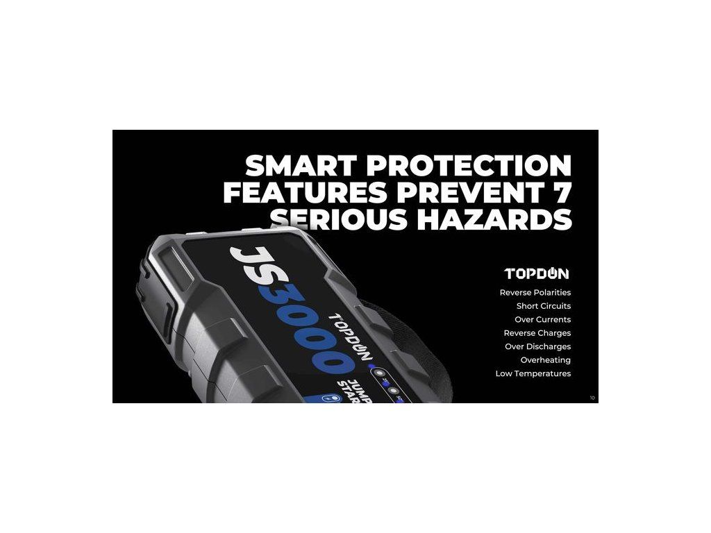 Přednosti: • Výstupní proud až 3000A • Kvalitní Li-ion baterie s kapacitou 24000mAh • Podpora rychlonabíjení standardem QC3.0 • Výkonné LED světlo se třemi módy (stálé, SOS, stroboskop) • Pevné a odolné startovací klipy s ochranou proti přepólování • Start vozidel max 7.0L pro dieselové motory, max 9.0L pro benzínové motory • Podpora rychlého nabíjení přes USB (5V/3A,9V/2A, 12V/1.5A) • Celkem 6 bezpečnostních ochran (Ochrana proti zkratu, přepětí, obrácené polaritě atd.) • Vysoký rozsah pracovních teplot od -10°C do +40°C • Ochrana IP64! • Bohaté příslušenství • Maximální bezpečnost produktu.