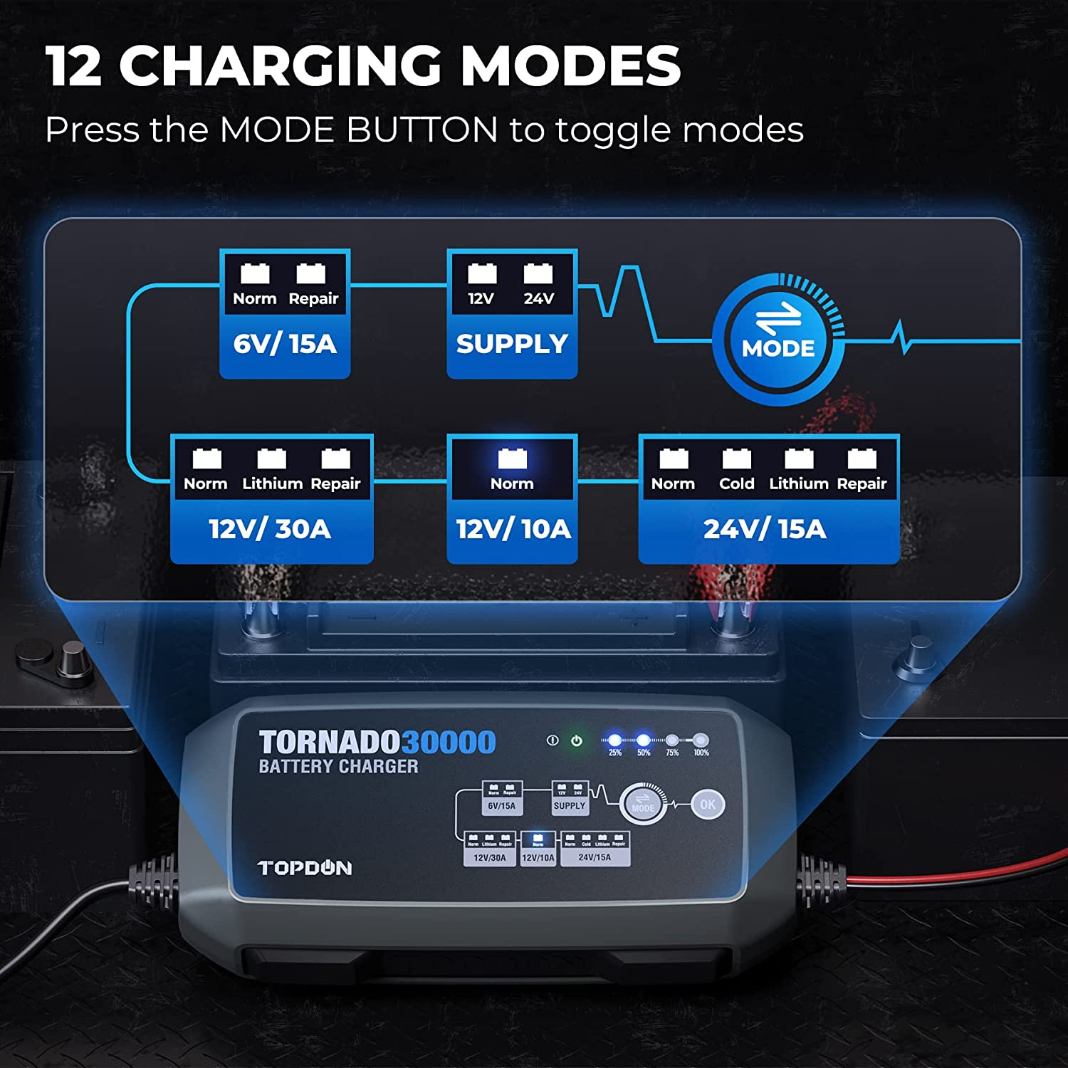 TORNADO 30000 dokáže automaticky detekovať sulfátáciu batérie a stratifikáciu kyseliny a pomocou funkcie pulznej opravy obnoví stratený výkon batérie pre silnejšie štartovanie motora a predĺženie životnosti batérie.