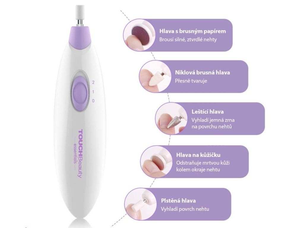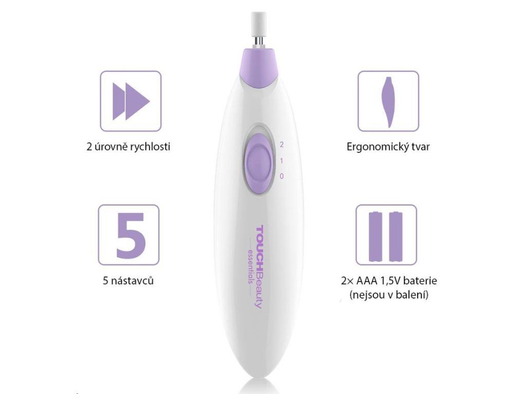TOUCHBeauty 1039 súprava na manikúru a pedikúru 5 v 1 Sada na manikúru a pedikúru TOUCHBeauty 1039 je vhodná pre tvarovanie, opravy, brúsenie, leštenie a vyhladzovanie nechtov. Ponúka dokonca 5 rôznych nástavcov, 2 rôzne pracovné rýchlosti, a cestovné púzdro na prístroj a nástavce. Je vhodná pre starostlivosť o prírodné i umelé nechty, vyhladzuje hrubú kožu a odstraňuje mozole. 5 nástavcov na manikúru a pedikúru Plstená hlavica Leštiaca hlavica Hlavica na kožičku Niklová brúsna hlavica Hlavica s brúsnym papierom Vysoký výkon s dvoma nastaviťeľnými rýchlosťmi Dve nastaviteľné rýchlosti, ktoré vyhovujú potrebám manikúry a pedikúry. Vysoký výkon - motor ponúka až 9 500 otáčok za minútu! Kľúčové vlastnosti Súprava s 5 nástavcami - čistí, opravuje, tvaruje, ostrie, brúsia, leštia nechty, odstraňuje mozole. Dve nastaviteľné rýchlosti pre rôzny potreby manikúry a pedikúry. Výkonný a tichý motor. Ergonomický dizajn a veľmi nízka váha pre pohodlné používanie. Úložné puzdro bezpečne ochráni všetky prístroj i všetky nástavce. O značke TOUCHBeauty TOUCHBeauty je medzinárodná značka založená v roku 1999 a registrovaná vo Veľkej Británii a ďalších 53 krajinách a regiónoch. S 20 rokmi skúseností v kozmetickom priemysle sa TOUCHBeauty zameriava na dizajn, výskum a vývoj kozmetických výrobkov a výrobkov pre osobnú starostlivosť. V roku 1999 spoločnosť TOUCHBeauty vyvinula prvé vyhrievané klieštiky na mihalnice; v roku 2002 ohrievač riasenky; v roku 2003 LED líčiace zrkadlo a v roku 2004 vyvinula prvý rotujúce čistič tváre. Ako odborník na krásu niekoľkokrát sponzorovala medzinárodnú súťaž Miss Model of the World. V súčasnej dobe má TOUCHBeauty šesť kategórií výrobkov: starostlivosť o tvár, starostlivosť o telo, starostlivosti o hlavu, doplnky na líčenie, pedikúra/manikúra a starostlivosť o muža. Spoločnosť TOUCHBeauty je vo viac ako 80 krajinách sveta uznávaná ako odborník na kozmetické prístroje a prístroje pre osobnú starostlivosť. Parametre TOUCHBeauty 1039 Model TB-1039 Napájanie 3 V / 0,54 W Batéria 2× AAA (nejsou součástí balení) Rozmery 13,5 × 3,6 × 3,4 cm Váha 44 g Obsah balenia TOUCHBeauty 1039 Návod na použitie v českom a slovenskom jazyku Puzdro na brúsku a príslušenstvo Plstená hlavica Leštiaca hlavica Hlavica na kožičku Niklová brúsna hlavica Hlavica s brúsnym papierom