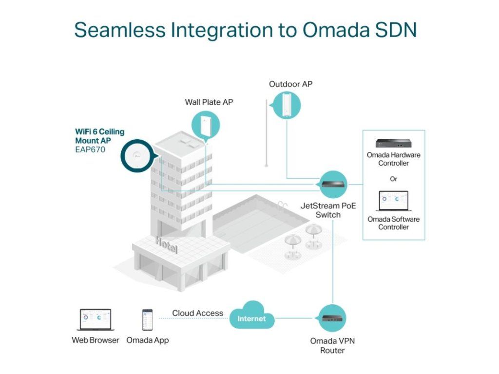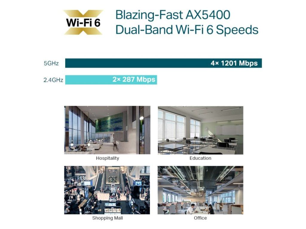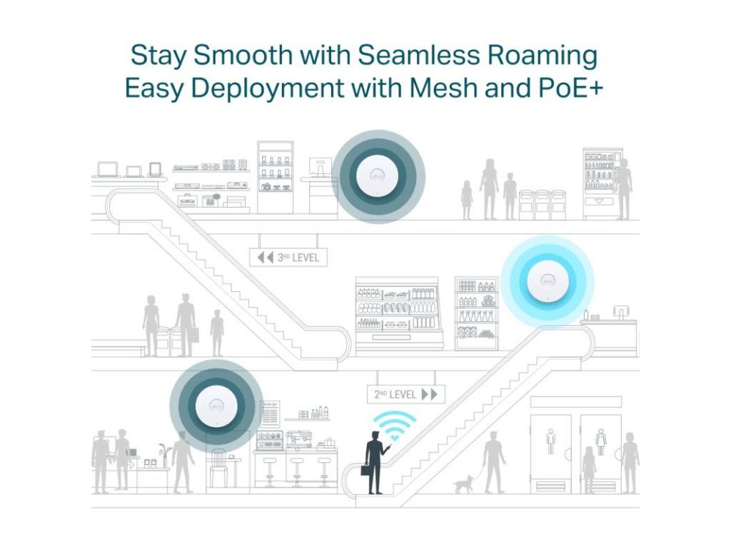 Dvojpásmový stropný prístupový bod s podporou Wi-Fi 6 (802.11ax) zaisťuje spolu s technológiou MU-MIMO špičkové dvojpásmové pripojenie s celkovou rýchlosťou 5378 Mb/s pri rýchlosti 574 Mb/sv pásme 2,4 GHz a 4804 Mb/sv pásme 5 GHz. Prístupový bod podporuje ako 802.3at PoE+, tak napájanie dodávaným adaptérom DC 12 V. Elegantný vzhľad a jednoduché uchytenie pre ľahké upevnenie na stenu alebo strop uľahčuje nasadenie a flexibilitu. Omada Mesh: Umožňuje bezdrôtové pripojenie medzi prístupovými bodmi pre väčší dosah a flexibilné nasadenie. Kompletné portfólio produktov OMADA SDN, ktoré môžete kombinovať, nájdete TUDodatočné parametre