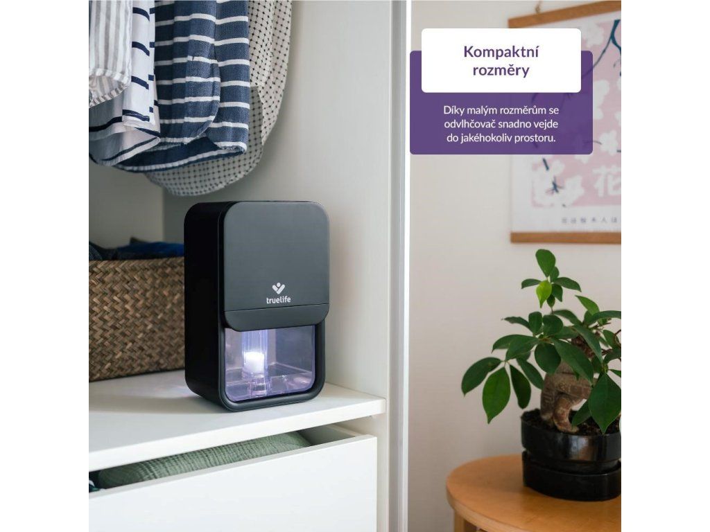 TrueLife AIR Dehumidifier DH3 bol navrhnutý s ohľadom na každodennú realitu, teda jeho hlavným cieľom je, aby fungoval spoľahlivo, ale zároveň nezaberal veľa miesta. Vďaka svojmu elegantnému a priestorovo úspornému dizajnu sa ľahko vmestí do spálne, obývačky aj kancelárie, bez narušenia vzhľadu interiéru. Napriek tomu dokáže efektívne znižovať vlhkosť v miestnosti a vytvoriť zdravšie prostredie, v ktorom sa vám bude lepšie dýchať.