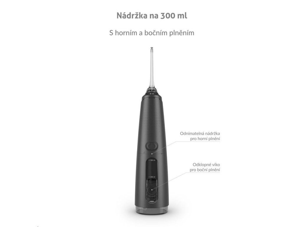 Nádržka o objeme 300 ml vystačí na vyčistenie celého chrupu a zároveň je dostatočne kompaktná. Okrem obyčajnej vody ju môžete naplniť ústnou vodou pre extra sviežosť.