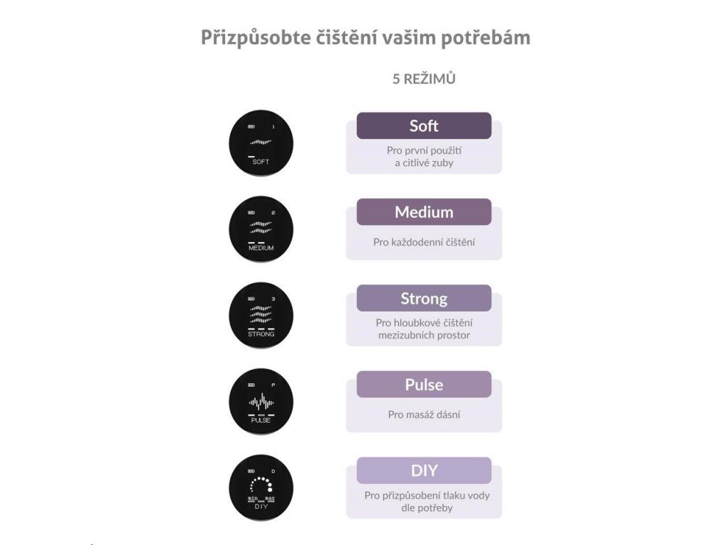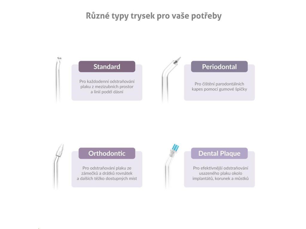 Súčasťou balenia je 6 rôznych druhov trysiek C-series, sprchu tak môže využívať celá rodina. Ďalšie trysky pre rôzne dentálne potreby je prípadne možné dokúpiť.