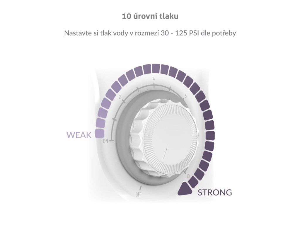 U AquaFloss Station S600 máte na výber z desiatich úrovní tlaku vody, v rozmedzí 30–125 PSI, čistenie zubov si tak môžete plne prispôsobiť. Požadovaný tlak si nastavíte pomocou kolieska na stanici. Súčasťou sprchy je 6 špeciálnych trysiek (3× Standard, 1× Orthodontic, 1× Periodontal, 1× Dental Plaque), navrhnuté pre rôzne potreby: