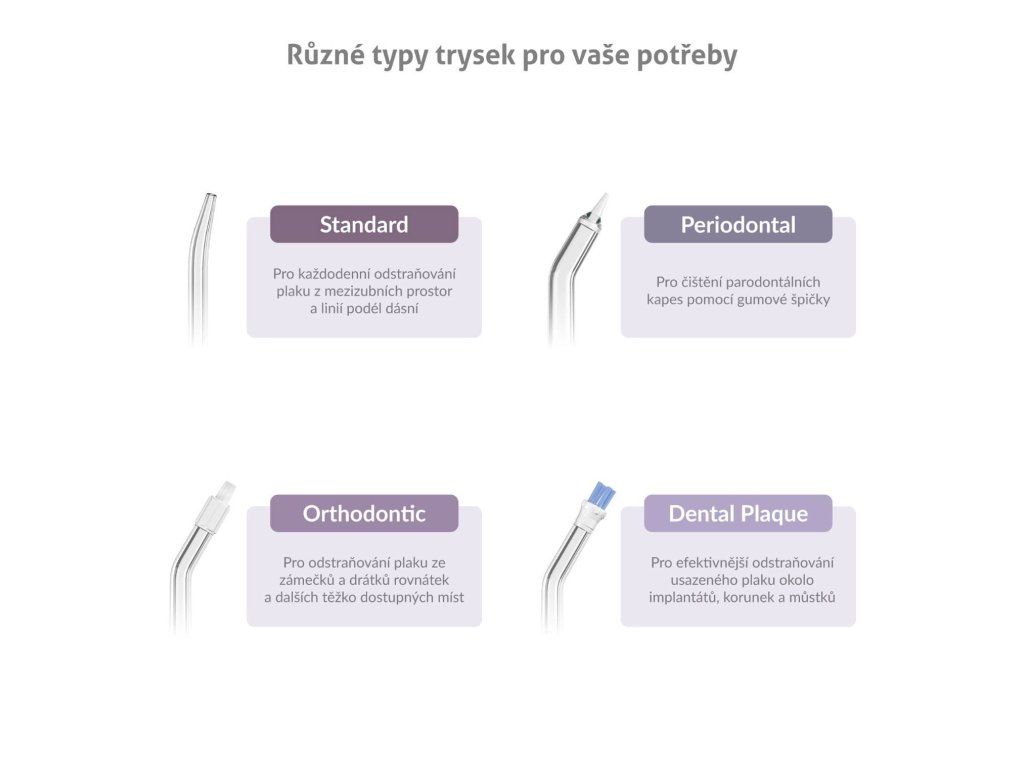 - Orthodontic – Ortodontická tryska pre odstraňovanie povlaku zo zámkov a drôtikov zubného strojčeka a ďalších ťažko dostupných miest
