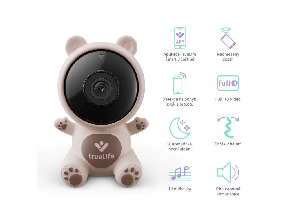 Strážiť svoj najväčší poklad teraz môžete vďaka chytrej pestúnke TrueLife NannyCam S3 Smart. Malá prenosná kamera sa ukrýva v silikónovom tele s dizajnom roztomilého medvedíka. V detskej izbe tak prirodzene a dokonale splynie s jeho ďalším vybavením. Pestúnka navyše možno vďaka priloženému ohybnému držiaku uchytiť kamkoľvek a v noci vie poslúžiť aj ako lampička jemne osvetľujúca detské kráľovstvo. Pre lepšie zaspávanie prehrá dieťatku vybranú uspávanku alebo je možné využiť možnosť obojsmernej komunikácie, kedy ho v prípade potreby upokojíte vlastným hlasom. Medvedí strážca komunikuje prostredníctvom dobre zabezpečenej TrueLife Smart aplikácie, ktorú si kompletne v slovenčine stiahnete do vášho telefónu. Vo Full HD kvalite potom odkiaľkoľvek a vďaka nočnému videniu aj v tme vidíte všetko, čo sa v izbe dieťaťa deje. A pokojne nielen tam, k aplikácii pripojíte pohodlne až 16 kamier a neobmedzený počet užívateľov. Celá rodina tak pri šikovnom rozmiestnení kamier môže sledovať aj pokroky dieťaťa, či už sa hrá alebo robí prvé kroky. Z pestúnky je možné urobiť aj záznam či fotografiu a okamžite vás upozorní, či detekuje pohyb, zvuk alebo zmenu teploty v miestnosti.