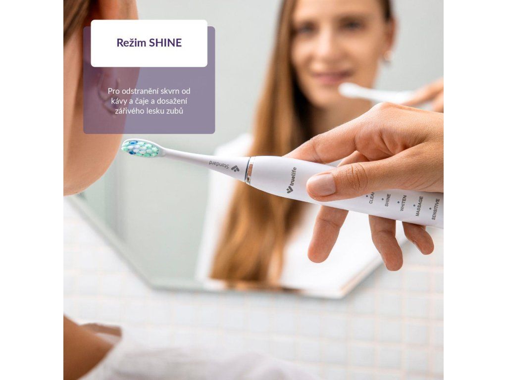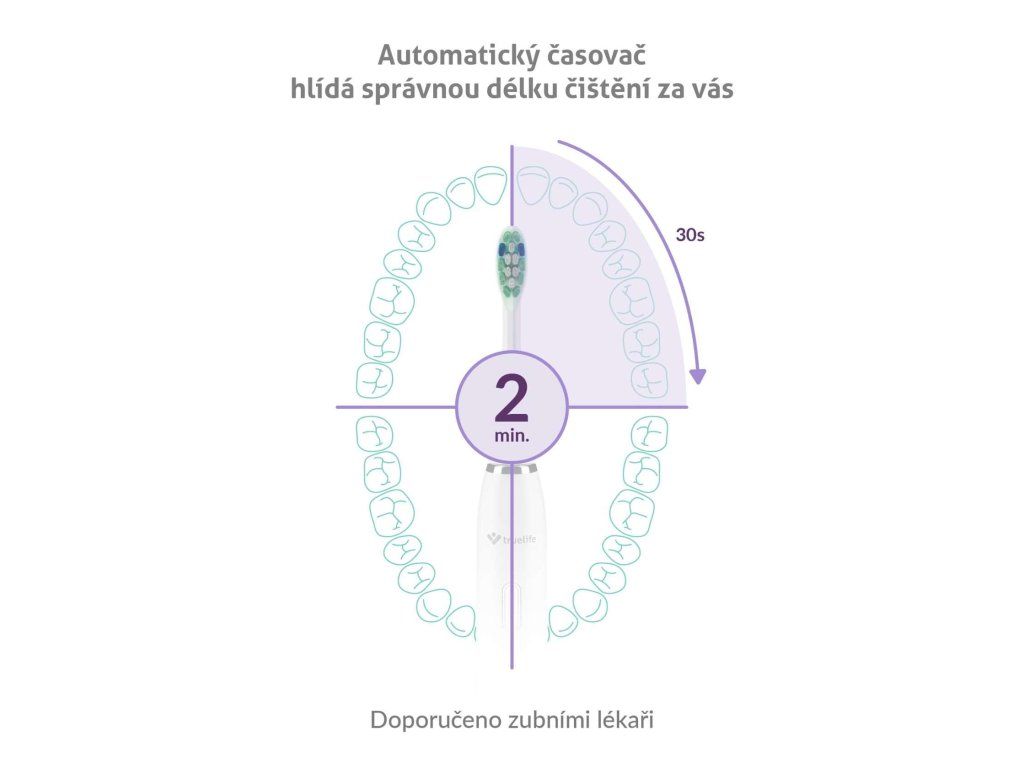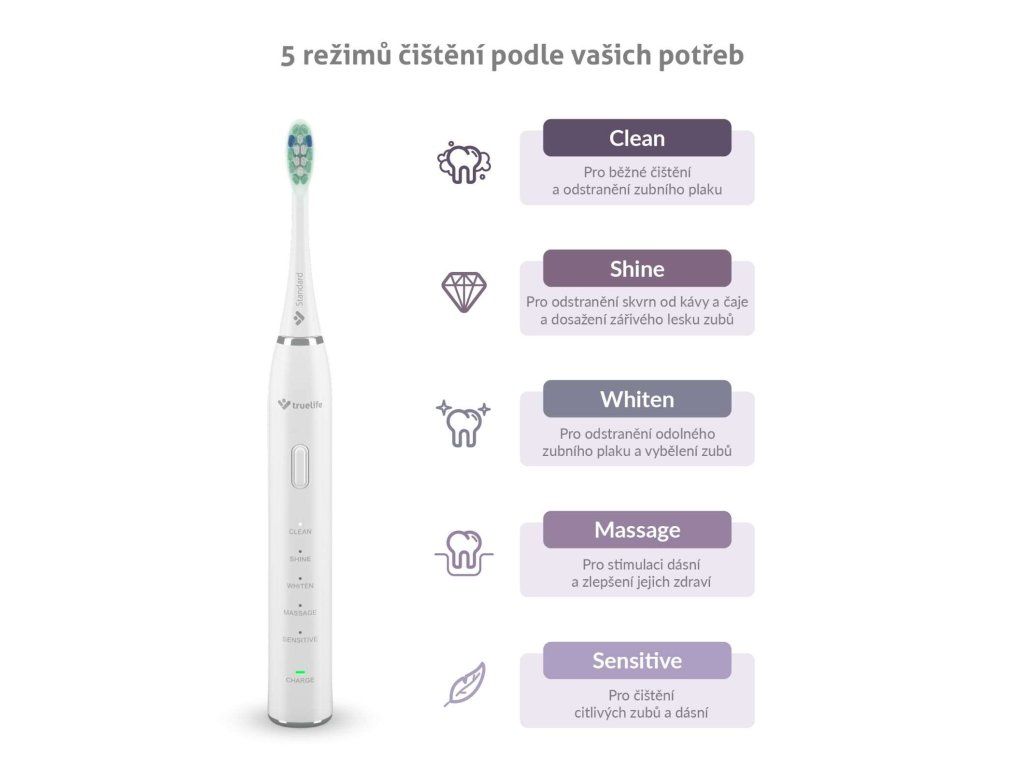 Sonická kefka TrueLife SonicBrush Clean30 je nastavená na ideálnu dobu čistenia 2 minúty a po 30 sekundách vždy krátkou pauzou upozorní, že je čas prejsť ku ďalšej sekcii. Disponuje 5 režimami, ktoré uľahčujú každodennú starostlivosť o zuby. Až uvidíte svoj žiarivý úsmev po použití režimu Shine, ktorý okrem bežného čistenia účinne odstraňuje aj škvrny od kávy a čaju, stane sa určite vašim favoritom. O bežné čistenie a odstránenie zubného povlaku sa postará režim Clean. Aj odolný zubný povlak nemá šancu pred režimom Whiten, ktorý prispieva ku bieleniu zubov. Ľudia s citlivými zubami a ďasnami ocenia špeciálny režim Sensitive. Skvelou bodkou za čistením je režim Massage stimulujúci ďasná, čím napomáha zlepšiť ich zdravie.
