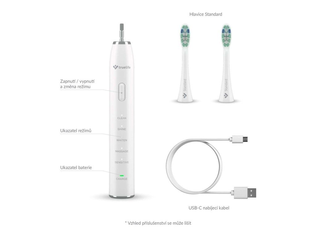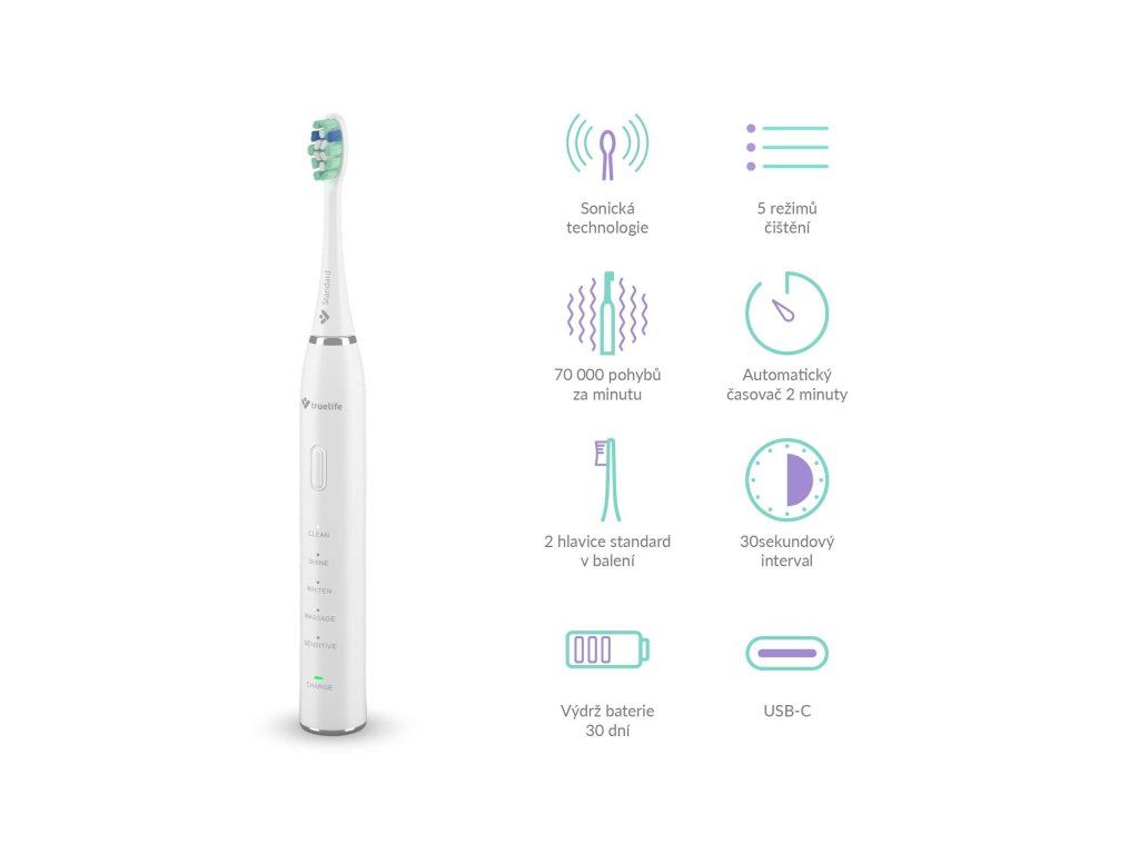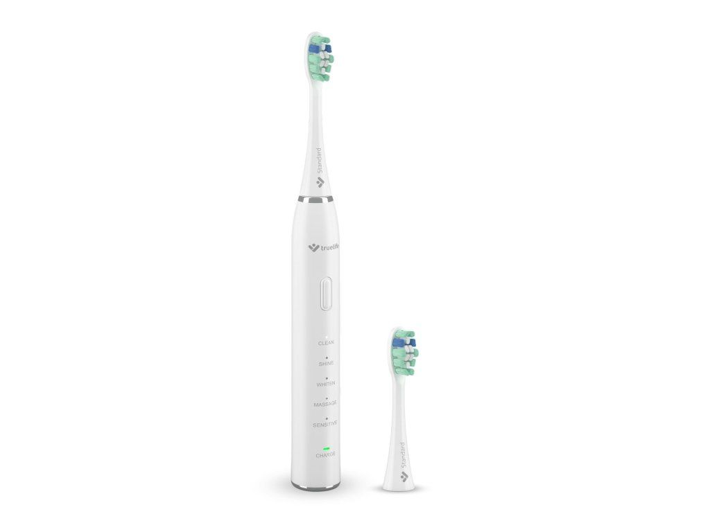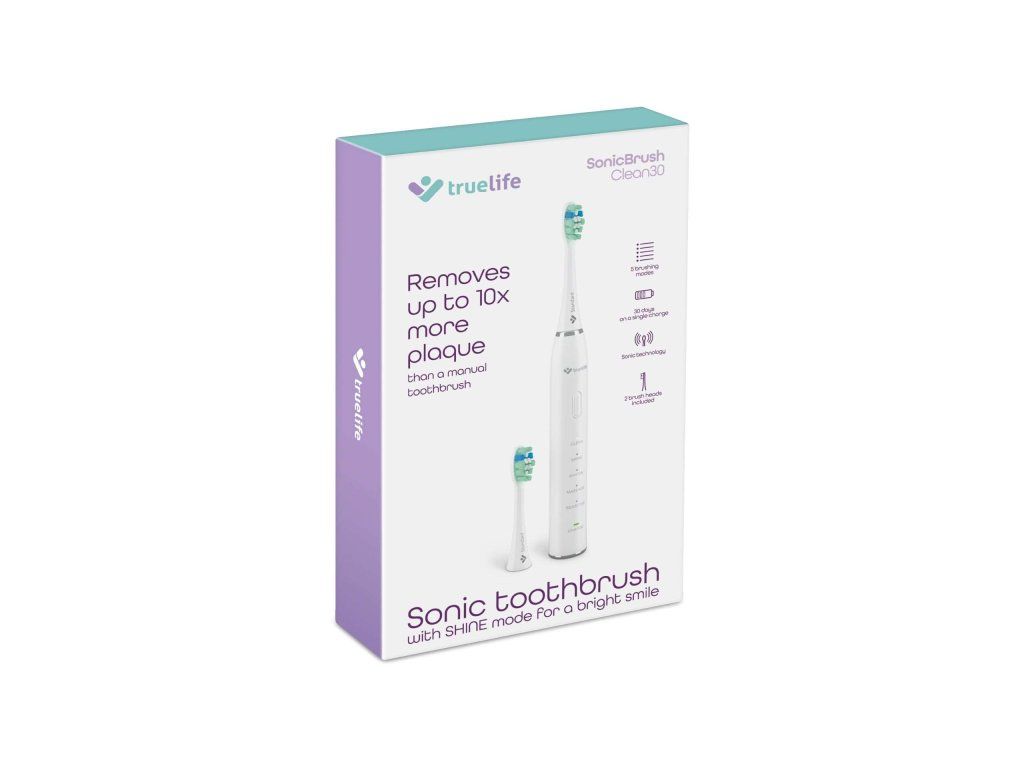 Krásny úsmev začína správnou každodennou starostlivosťou o zuby. Skvelým cenovo dostupným a výkonným pomocníkom je sonická kefka TrueLife SonicBrush Clean30 so sonickou technológiou SonicTrue®. Jej 70 000 pohybov za minútu zuby dokonale vyčistí a ide ešte ďalej vďaka možnosti výberu z 5 režimov čistenia. Clean vyčistí zuby a odstráni zubný povlak, Shine zbaví zuby škvŕn od čaju a kávy, na vybielenie slúži režim Whiten, ďasnám urobí dobre Massage a pre citlivé zuby a ďasná je určený režim Sensitive. Balenie obsahuje 2 hlavice Standard, ktorých modré štetinky zhruba po troch mesiacoch zbelejú. Tým indikujú, že je potrebné hlavicu vymeniť. Na jedno nabitie vydrží kefka 30 dní, potom ju iba stačí dobiť pomocou priloženého USB-C kábla.