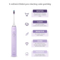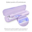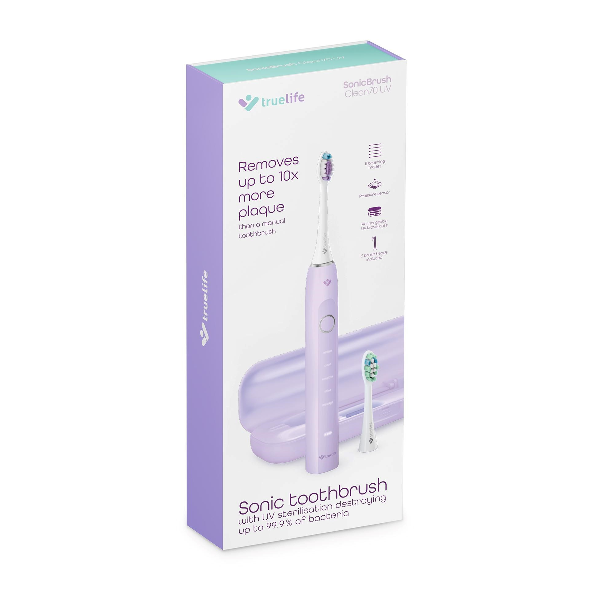 Inteligentné technológie pre to najlepšie dentálne ošetrenie sa stretávajú v TrueLife SonicBrush Clean70 UV, sonickej kefke v elegantnej levanduľovej verzii, ktorá odstráni s výkonom až 90 000 pohybov za minútu až 12× viac zubného plaku ako manuálna kefka. Sonická technológia SonicTrue pomocou jemných vibrácií čistí plochy zubov a vďaka víreniu vody s pastou vytvára mikrobublinky, ktoré prenikajú do medzizubných priestorov. Tlakový senzor s technológiou SmartPressure sleduje, aby ste si pri prílišnom tlaku na zuby a ďasná nepredstavovali zdravotné ťažkosti. Veľkú službu vám poskytne aj UV sterilizácia ukrytá v nabíjacom puzdre, ktorá efektívne ničí až 99,9 % baktérií a vírusov z hlavice kefky. O svoje zuby sa môžete starať doma aj na cestách, a to až 70 dní na jedno nabitie, pomocou 5 režimov čistenia (Whiten, Clean, Sensitive, Shine, Massage) a 2 priložených hlavíc (Standard a Sensitive). Posledný použitý režim zostáva uložený v pamäti a automaticky sa spustí pri opätovnom zapnutí. Kefka beží ideálne 2 minúty, na ktoré je nastavený časovač. Vďaka vysoko citlivému vibračnému senzoru sa navyše automaticky aktivuje a rozsvieti, keď ju vezmete do ruky, stačí ju len uchopiť a môžete začať s čistením. Špeciálny jemne pogumovaný povrch rukoväte je príjemný na dotyk a zabraňuje klzaniu aj pri použití s vodou.