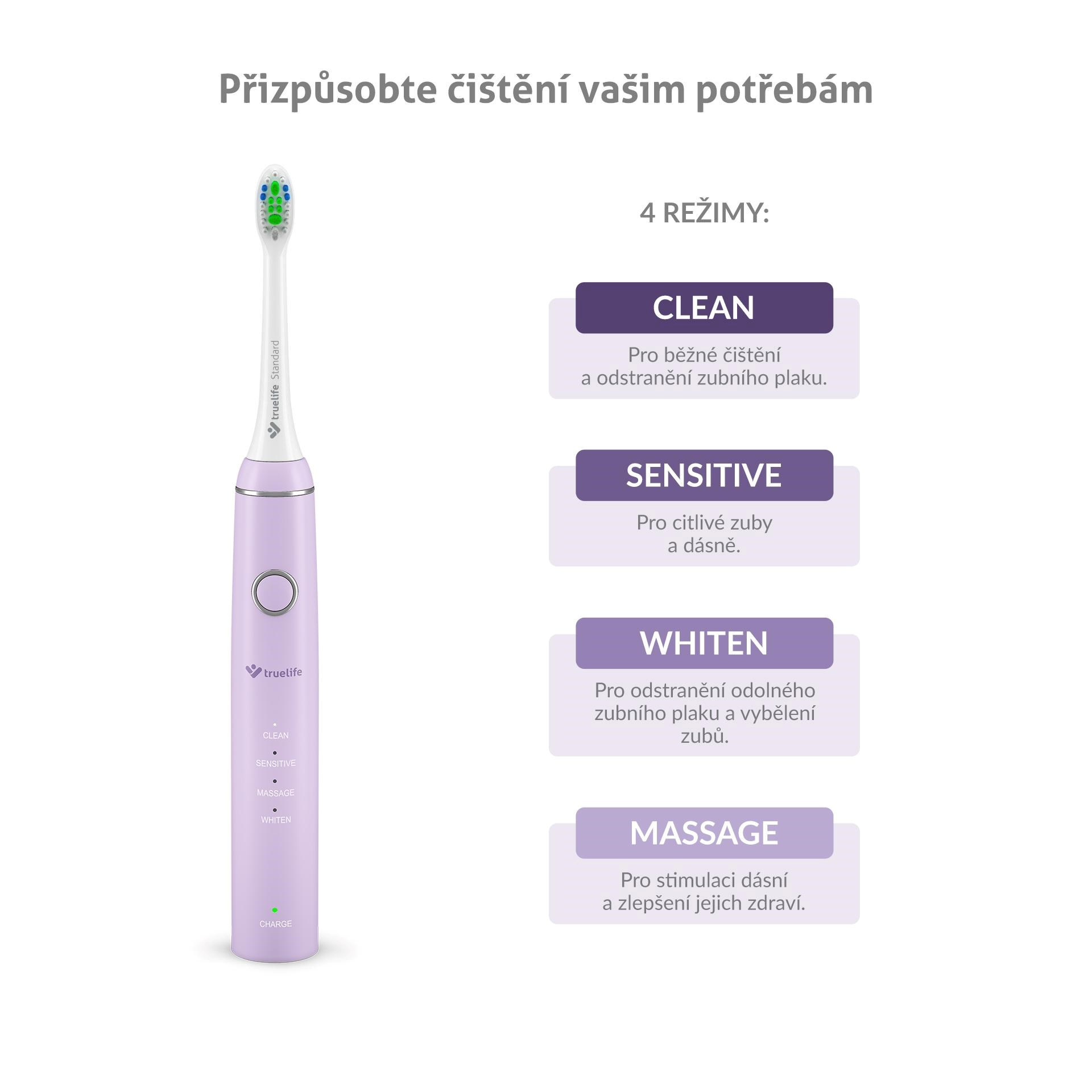 SonicBrush Compact Lavender má 4 režimy čistenia, ktoré sa komplexne postarajú o vaše ústa. Režim Clean je najbežnejší a hodí sa na každodenné použitie. Citlivé zuby a ďasná môžete pokojne zveriť režimu Sensitive. Na krásny biely úsmev vám pomôže režim Whiten a príjemnú masáž ďasien zabezpečí režim Massage.