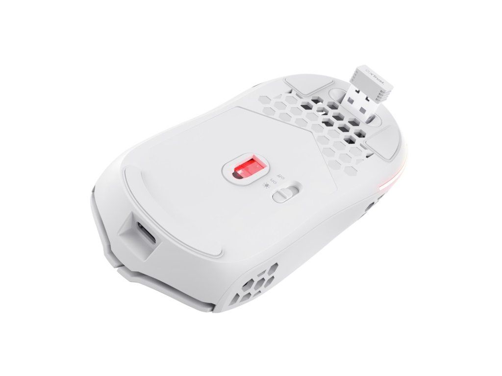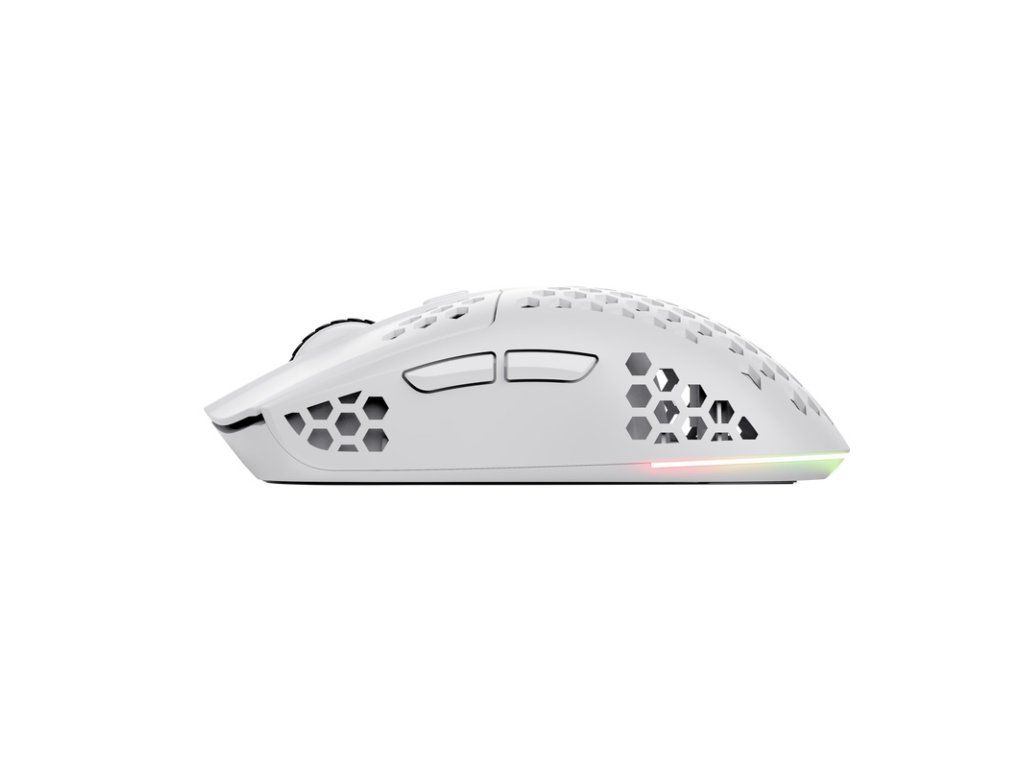 Trust Gaming GXT 929W Helox ultra lehká bezdrátová herní myš s vícebarevným LED podsvícením * voštinové pouzdro dodá vaší sestavě jedinečnost a styl * nízká latence bezdrátového připojení přes 2,4GHz micro-USB přijímač pro hraní bez zpoždění * vestavěná dobíjecí baterie s výdrží až 80 hodin nepřetržitého provozu, se kterou zábava nikdy neskončí * vícebarevné LED podsvícení se 3 barevnými režimy rozzáří vaši herní sestavu * díky přiloženému kabelu můžete hrát dál i během nabíjení