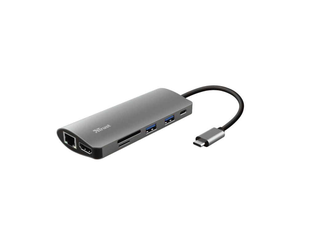 Trust Dalyx 7-in-1 USB-C Multiport Adapter. Stylový hliníkový víceportový adaptér pro přidání portů HDMI, sítě, čtečky karet, USB-C a USB do vašeho notebooku pomocí jediného připojení USB-C. Tenké notebooky jsou skvělé, ale jejich nedostatek portů pro připojení může být problém. S adaptérem Trust Dalyx 7 v 1 se vaše produktivita zvýší sedmkrát díky přiloženému připojení HDMI, Ethernet, paměťové karty, USB a USB-C.Klíčové vlastnosti *Přidejte do svého notebooku nebo tabletu další porty HDMI, síť, čtečku karet, USB a USB-C pomocí jediného portu USB-C *Připojte monitor nebo televizi přes port HDMI *Obraz v ultravysokém rozlišení v bohatých barvách díky HDR a HDMI 1.4 (4k30Hz) *2x USB porty pro příslušenství, jako je klávesnice, myš a externí disky *Podporuje rychlé datové přenosy (5 Gbps) *Nabijte svůj MacBook nebo jiné notebooky přes nabíjecí port USB-C (až 100 W) *Síťový port s podporou Gigabit Ethernet pro spolehlivé a stabilní připojení k internetu *Čtečka karet se sloty pro karty SD i micro SD *Odolné a stylové hliníkové pouzdro *Tenký a kompaktní, snadno přenosný při cestování *Funguje na každém notebooku, MacBooku a tabletu s portem USB-C