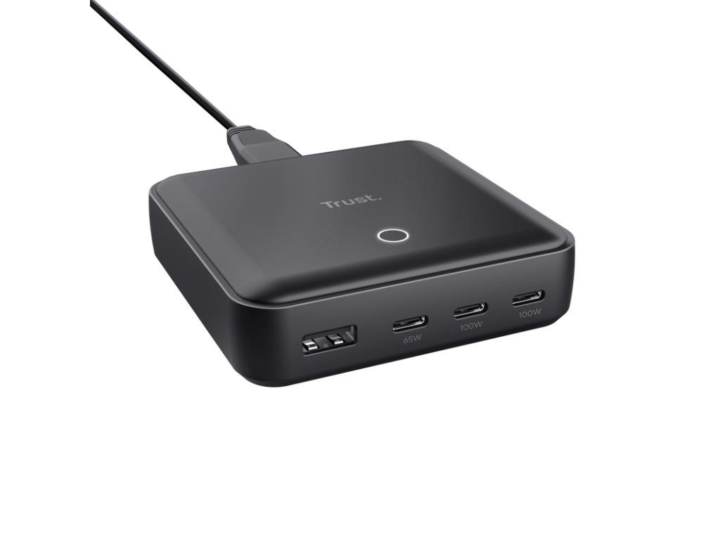TRUST Maxo 100W 4-portová USB stolní nabíječka 100W 4portová stolní nabíječka USB navržená tak, aby ji bylo možné snadno umístit na stůl, stůl nebo skříňku. Doby, kdy na jedno zařízení připadala jedna nabíječka, jsou dávno pryč - Maxo dokáže napájet všechny druhy zařízení a umožňuje dobíjet notebook, telefon i tablet z jediné nabíječky najednou. Pohodlné bydlení je tady!