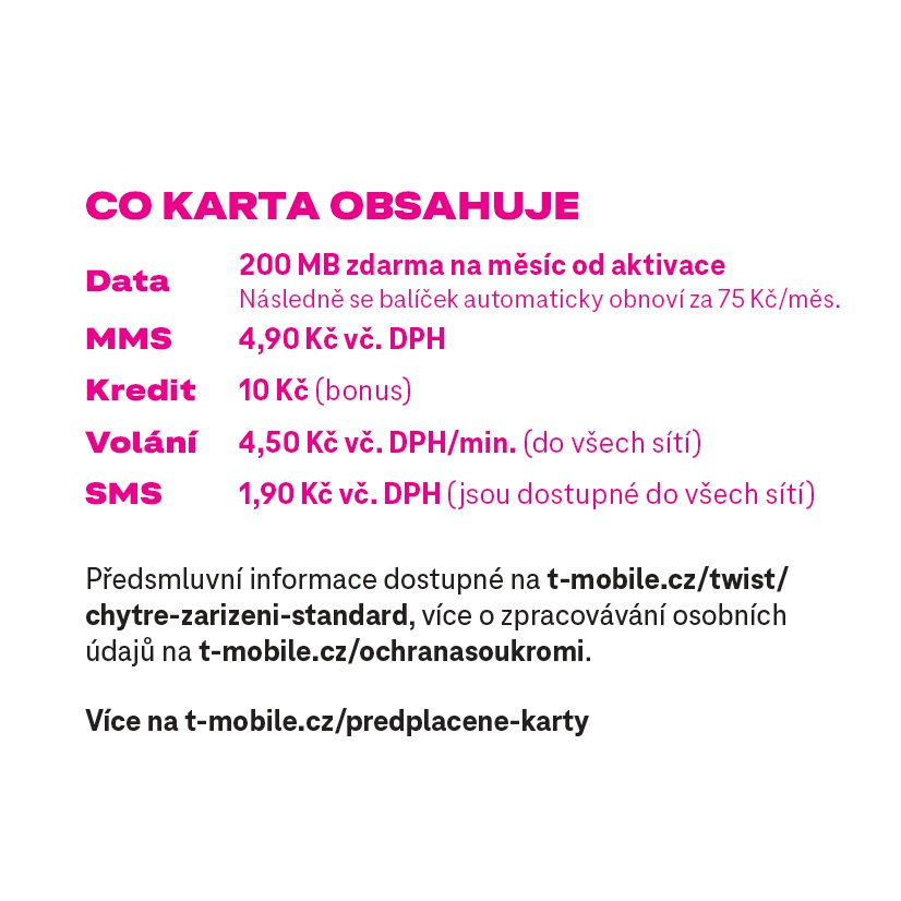 PŘEDPLACENÁ KARTA PRO CHYTRÉ ZAŘÍZENÍ Předplacená karta od T-Mobilu vhodná pro chytrá zařízení s malým objemem datových přenosů typu dětské hodinky, hlídací zařízení, pohybová čidla nebo chytré hodinky. Zkontrolujte si v aplikaci nastavení, případně si vyberte výhodnější balíček. Například s měsíčním datovým limitem 80 MB, 5 GB, 20 GB anebo roční balíček s měsíčním datovým limitem 2 GB. Služby lze využívat ,V RÁMCI CELÉ EU