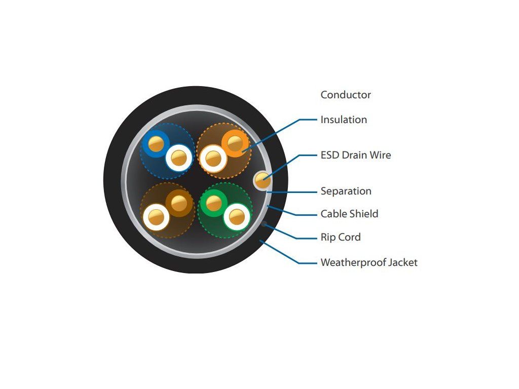 UISP-Cable-Pro je kábel kategórie 5e s vysoko izolačným plášťom odolným proti poveternostným vplyvom, ktorý zabraňuje poškodeniu dažďom, snehom a inými extrémnymi klimatickými podmienkami. Kábel je tiež obohatený o vnútorné fóliové tienenie a odtokový drôt, ktorý ho kolektívne chráni pred elektrostatickým výbojom (ESD) a umožňuje mu udržiavať rýchlosť spojenia Gigabit Ethernet aj v prípade elektromagnetického rušenia.