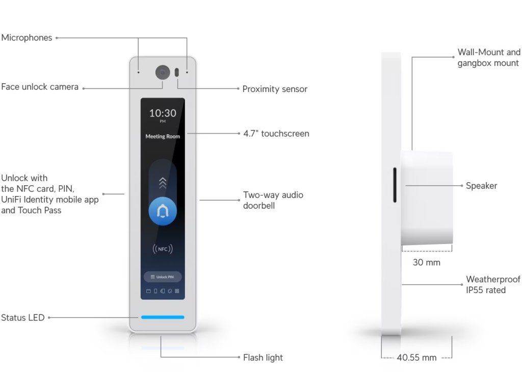 Ubiquiti UniFi Access G3 Reader Pro Vnitřní/venkovní čtečka NFC třetí generace a interkom s podporou Apple Touch Pass. Dveře jednoduše odemknete pomocí obličeje, karty NFC, kódu PIN, mobilní aplikace UniFi Identity či Touch Pass. * 4,7'' dotykový displej a integrovaná kamera * Mobilní přístup pomocí aplikace a funkce interkomu * Odemykání pomocí kódu PIN na obrazovce * Správa pomocí UniFi Access: verze 3.0.15 a novější * Kompatibilita s Apple Wallet