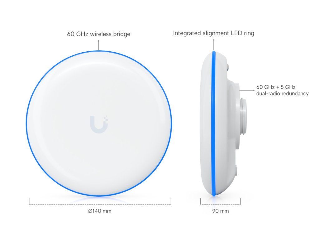 Klíčové vlastnosti Bezdrátový PtP most s technologií 60 GHz + záložní 5 GHz Maximální rychlost až 1,7 Gbps (60 GHz) Dosah až 500 m 2×2 MU-MIMO (5 GHz) Napájení přes PoE (adaptér součástí balení) Odolnost vůči povětrnostním vlivům IPX6 Správa přes Ethernet a Bluetooth Montáž na zeď nebo stožár