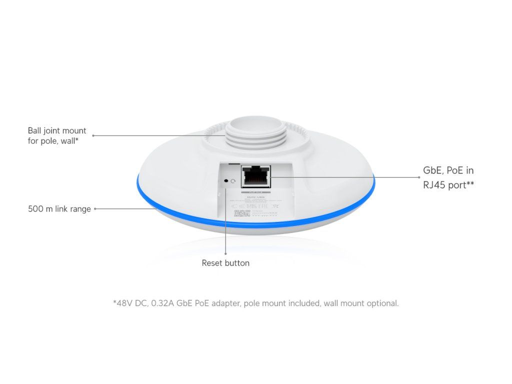 Hardware Port: 1× GbE RJ45 Max. spotřeba: 11 W Napájení: PoE (44–57 V DC) Tlačítko: Factory reset LED indikace: RGB stavová LED Materiál: UV odolný polykarbonát Hmotnost: 376 g