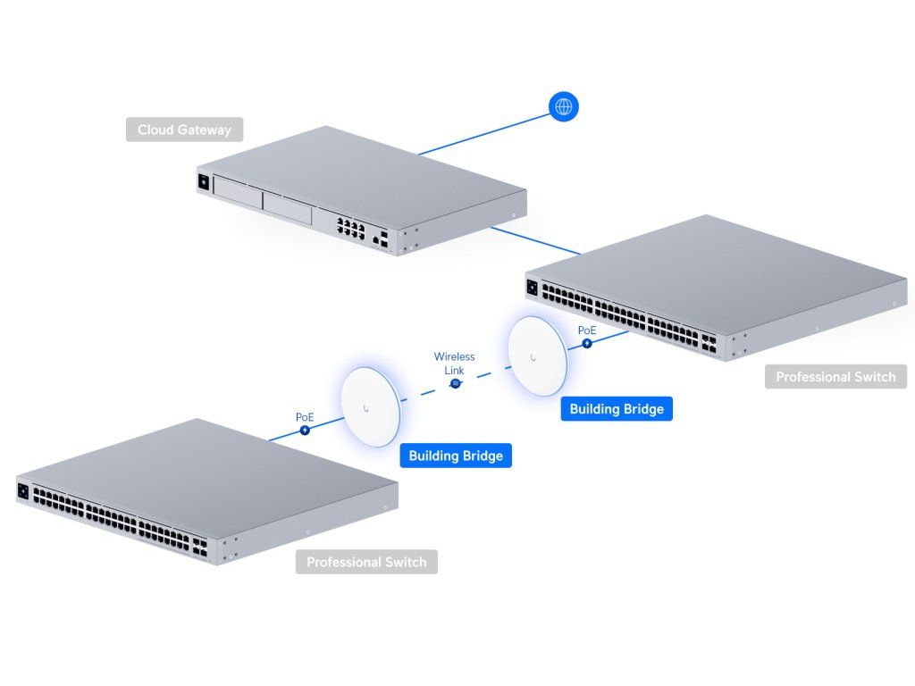 Instalace a správa * Provozní režim: Point-to-Point (PtP) * Montáž: zeď nebo stožár * Správa přes Ethernet nebo Bluetooth * NDAA Compliant * Certifikace: CE, FCC, IC UniFi Building-to-Building Bridge je ideálním řešením pro rychlé a stabilní propojení dvou objektů bez nutnosti pokládky kabeláže. Díky kombinaci 60GHz vysokorychlostního spoje a 5GHz zálohy poskytuje maximální stabilitu i v náročných podmínkách.