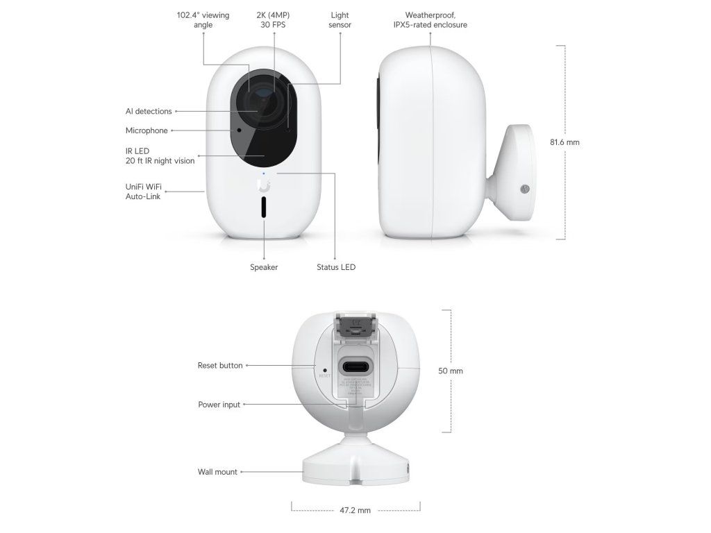 Popis produktu UniFi Protect G4 Instant kamera disponuje 5MP snímačem (2688x1512px) při 30fps, fixním objektivem 2,8mm, IR přísvitem pro noční vidění, mikrofonem a reproduktorem. Kamera má robustní a kompaktní tělo z polykarbonátu, odolnost IK04 proti vandalům a krytí IPX5 proti tryskající vodě. Do sítě se kamera připojuje pomocí Dual-Band WiFi s podporou standardů 802.11a/b/g/n/ac a napájení je řešeno přes USB-C kabel (5V/2A) s maximální spotřebou 6W. Důležité vlastnosti * 5MP, 30fps video * noční režim s IR LED diodami * IPx5 kryt odolný proti povětrnostním vlivům * vestavěný mikrofon a reproduktor * napájení pomocí USB-C * odolnost vůči vandalům - IK04 Obsah balení * zařízení * šroubky + hmoždinky * plastový plát pro přichycení ke zdi * USB-C kabel Technické parametry Rozměry: 81,6x50x47,2mm Hmotnost: 125g (bez montáže)|163g (s montáží) Senzor: 5MP CMOS sensor Čočka: Fixed focal length EFL 2,8mm, f/1,6 Zorný úhel: H: 102,4°, V: 54,9°, D: 120,6° Komprese: H.264/MJPEG Rozlišení: 2688x1512 (16:9) Procesor: Dual core Arm Cortex-A7 based chip Paměť: 2GB DDR3 Ovládání: UniFi Protect Síťové rozhraní: 802.11 a/b/g/n/ac WiFi|Bluetooth Maximální spotřeba: 6WDodatočné parametre