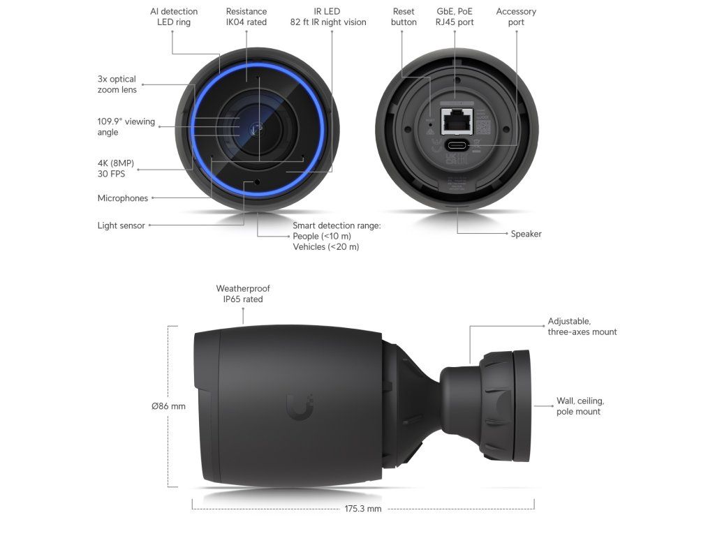UBIQUITI AI Professional Vnitřní/venkovní kamera 4K PoE s 3× optickým zoomem a funkcí inteligentní detekce na velkou vzdálenost. *Rozlišení videa 4K (8 MP) *3x optický zoom *Pokročilá umělá inteligence: rozpoznávání osob, čtení poznávacích značek a další funkce *Vestavěné IR LED diody a automatický IR cut filtr *Soustava mikrofonů s dalekým dosahem pro obousměrný přenos zvuku *Připojení a napájení pomocí PoE *Odolnost vůči povětrnostním vlivům (vystaveno venkovním podmínkám)