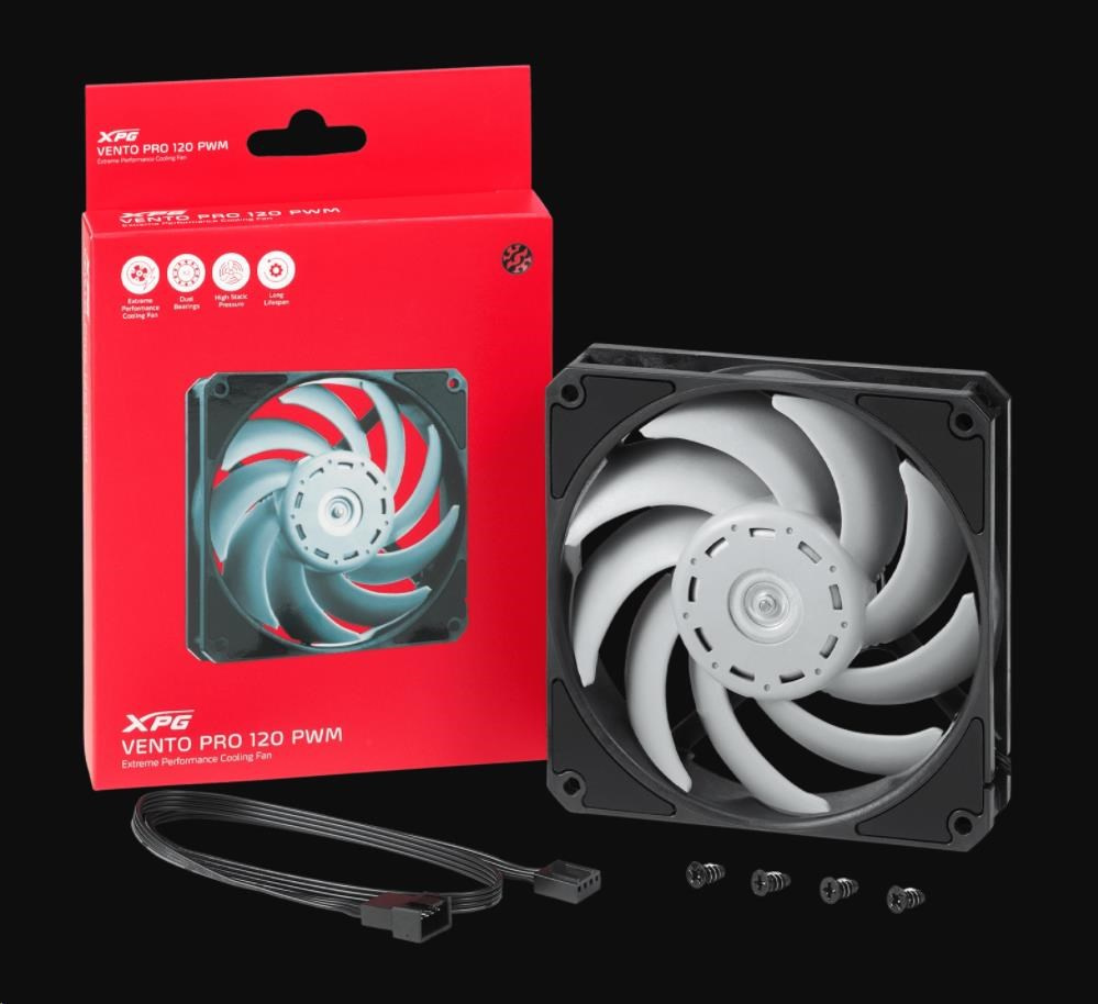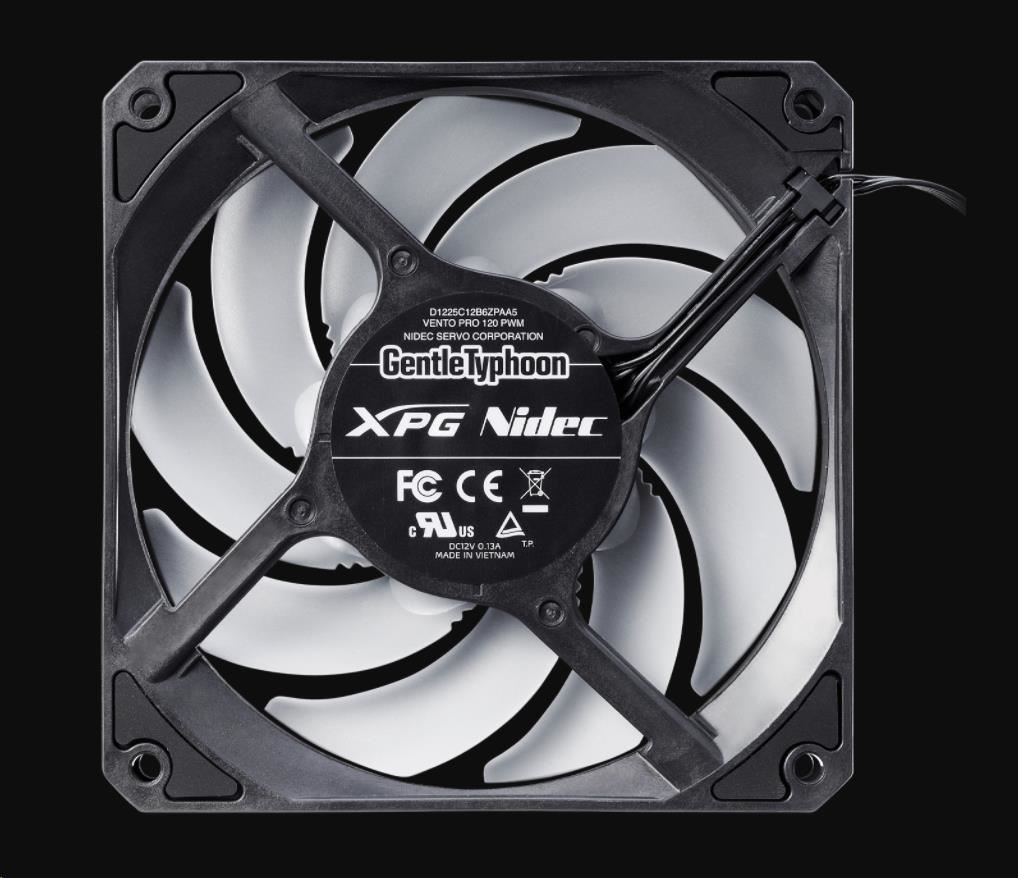 tok vzduchu až 75 CFM. Díky tomu je ideálním pomocníkem pro přívod a odvod vzduchu pro doplnění vodních chladičů. Nebo jej lze nainstalovat dopředu bez ohledu na omezení toku vzduchu předním panelem a prachovým filtrem. Vrtule ventilátoru důmyslně tvarována tak, aby snižovala rušivé frekvence hluku ventilátoru na jemnější „tón vibrací“, který lépe vyhovuje lidskému sluchu. Navíc se 4 protivibračními gumovými podložkami vytváří ventilátor XPG VENTO PRO 120 PWM