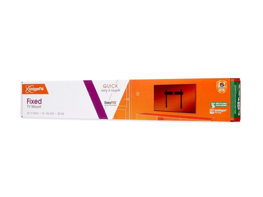 Rychlá a snadná instalace Nástěnné držáky televizorů QUICK se velmi snadno a rychle instalují díky jedinečnému systému EasyFIX™. Televizor můžete na stěnu připevnit ve třech jednoduchých krocích a užívat si jej již během maximálně 20 minut. Součástí balení je vrtací šablona, šrouby a hmoždinky Fischer® DuoPower. Všechny kroky instalace jsou jasně a stručně vysvětleny v přiloženém rychlém návodu k instalaci. Podrobný návod k použití si můžete prohlédnout také online nebo se podívat na instalační video. S bezplatnou aplikací DrillRight™ AR si snadno vyznačíte první vrtací otvor na stěně. Pak stačí jen přiložit vrtací šablonu. Praktické také je, že váš nástěnný držák televizoru QUICK Fixed má zabudovanou vodováhu. Montáž televizoru do perfektní roviny je proto velmi snadná.